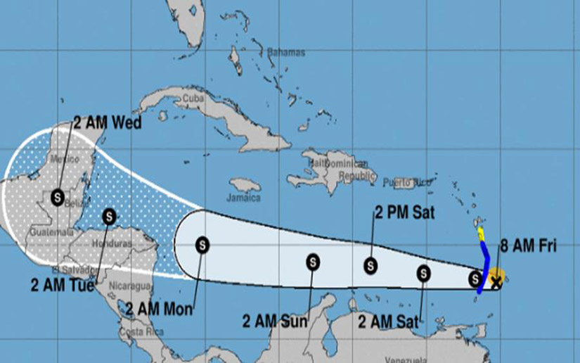 El centro de la tormenta Harvey está a unos 55 millas al oeste de Barbados y 60 millas al este sureste de Santa Lucía. Avanza en dirección oeste a casi 18 millas por hora.