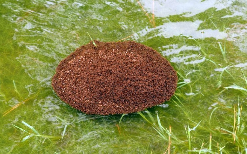 Con su hábitat totalmente transformado por las intensas lluvias, miles de estos insectos, también conocidas como hormigas coloradas, se agruparon instintivamente para flotar, formando una "masa" entre sí. Solas y separadas nunca hubieran sobrevivido a la impresionante crecida del agua.