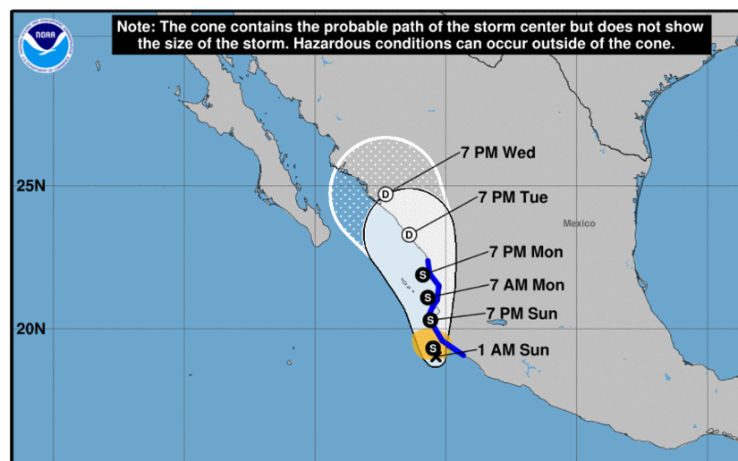 El Centro Nacional de Huracanes de Estados Unidos informó que Pilar registraba vientos máximos sostenidos de 75 km/h el domingo por la mañana. Su centro se encontraba a unos 95 kilómetros al sur de Cabo Corrientes, la punta de tierra en un extremo de la bahía donde se encuentra Puerto Vallarta. El fenómeno se movía hacia el noroeste a unos 10 km/h.