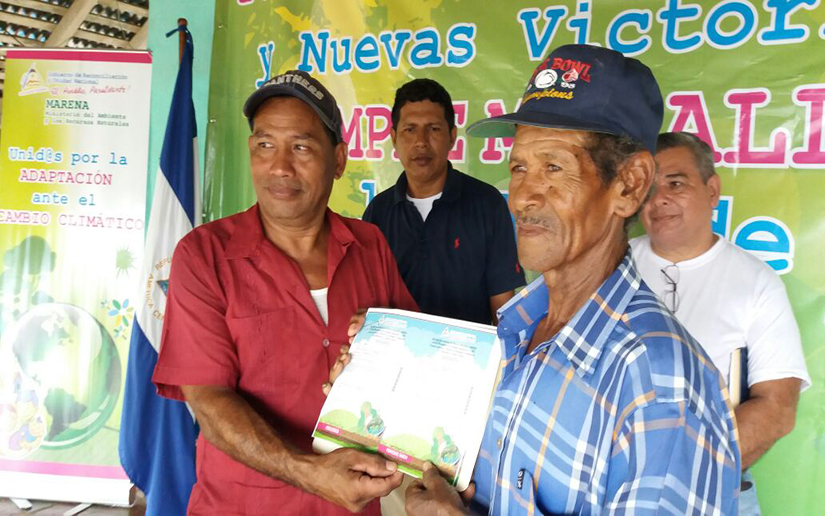 El Ministerio del Ambiente y los Recursos Naturales (MARENA), el Instituto Nicaragüense de Tecnología Agropecuaria (INTA) y autoridades municipales de Tisma, en el departamento de Masaya, entregaron a pequeños y medianos productores "bonos de adaptación al cambio climático" en nombre del Gobierno Sandinista.
