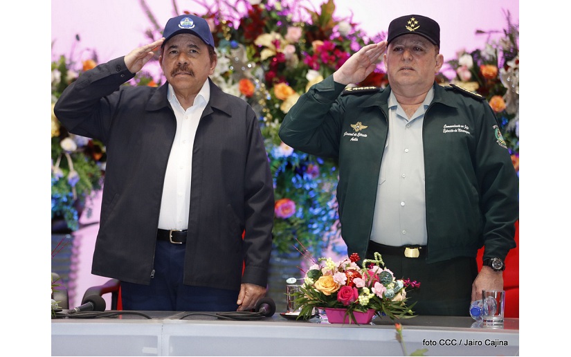 Presidente, queremos expresarle en nombre de todos los que integramos el Ejército de Nicaragua, nuestro Agradecimiento por su decidido respaldo para cumplir nuestros Deberes con la Patria... Gracias, Presidente. Compañera Vicepresidenta Rosario Murillo, gracias por su valiosa Cooperación y sus
