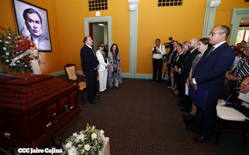 Nos acompaña el Presidente del Banco Cen-troamericano de Integración Económica, el Hermano Doctor Nick Rischbieth; vino anoche desde la Sede del BCIE que está en Honduras para acompañar a Silvio en este momento de su Tránsito hacia un Nuevo Plano de Vida, porque él sigue acompañando a su Familia, y nos sigue acompañando a todos nosotros, a todos los nicaragüenses.