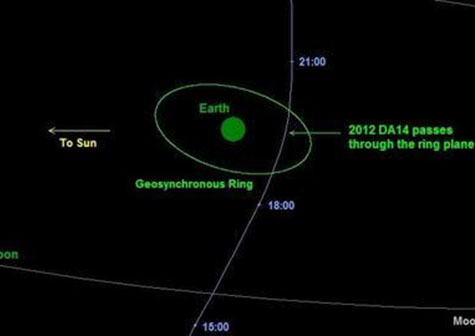 Esto no ocurrirá el 15 de febrero. «Definitivamente, 2012 DA14 no chocará contra la Tierra», subraya Yeomans. «La órbita del asteroide se conoce lo suficientemente bien como para descartar un impacto». A pesar de esa seguridad, los radares de la NASA seguirán la roca espacial en su aproximación a la Tierra. El asteroide pasará la brecha entre la órbita terrestre baja, donde se encuentran los satélites de observación y la Estación Espacial Internacional (ISS), y la banda superior de los satélites geoestacionarios, que proporcionan datos meteorológicos y de telecomunicaciones. «Las probabilidades de un impacto con un satélite son extremadamente remotas», dice Yeomans. Casi nada orbita donde pasará el asteroide.