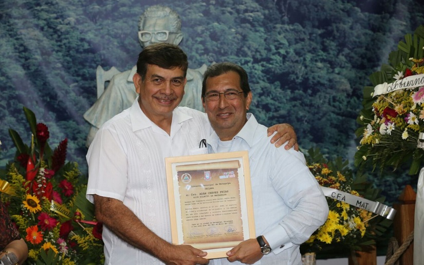 Ante la escultura del héroe nacional Carlos Fonseca Amador, el gobierno municipal de Matagalpa declaró hijos dilectos y entregó las llaves de la ciudad a los compañeros Adán Chávez y Elías Jaua.