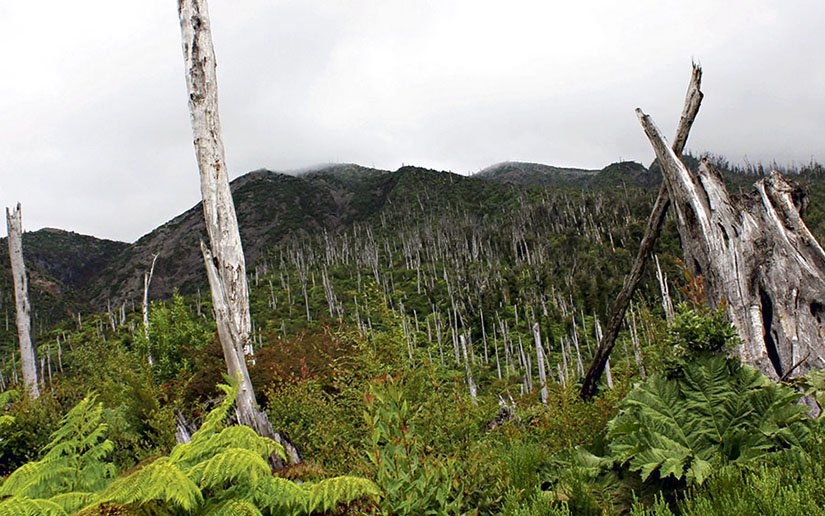 Antes de 2008, el entorno del volcán Chaitén se caracterizaba por la presencia de bosques del tipo “siempreverde”, dominado por especies como el coihue de Chiloé, tineos, arrayanes o luma. Todo esto desapareció luego de la erupción.