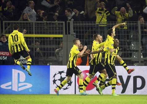 El jugador del Borussia Dortmund, Felipe Santana (d), celebra con sus compañeros tras marcar el tercer gol al Málaga CF durante el partido de vuelta de los cuartos de final de la Liga de Campeones disputado en Dortmund, Alemania, este martes.
