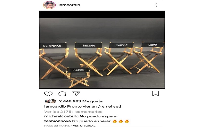 Pero no solo Selena realizo publicaciones, también Cardi B compartió una fotografía donde aparecen cinco sillas con los nombres de ella y los nombres de Selena G, Ozuna y DJ Snake.