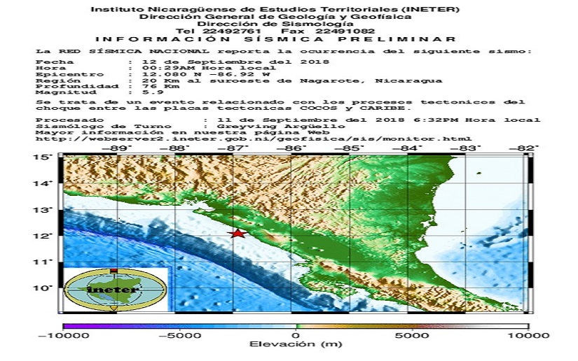 La madrugada de este miércoles, a eso de las 12:29 de la madrugada se presentó un sismo de Magnitud 5.9 en la escala de Ricther, a 20 kilómetros al suroeste de Nagarote, con una profundidad de 76 kilómetros.