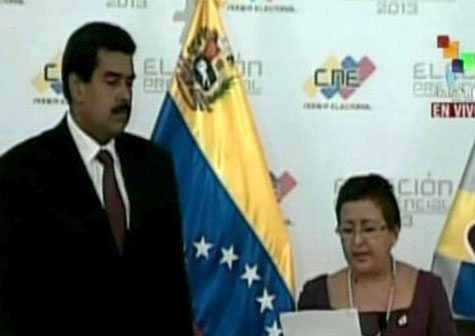 La presidenta del CNE, Tibisay Lucena, proclamó como triunfador a Maduro con 7 millones 563 mil 747 votos, que se traduce en el 50,75 por ciento de la votación y confirmó que el candidato antichavista quedó en el segundo lugar, con 7 millones 298 mil 491 votos, el 48, 97 por ciento. La participación fue de 79,17 por ciento del electorado.