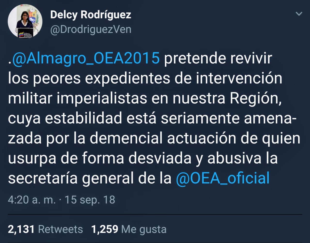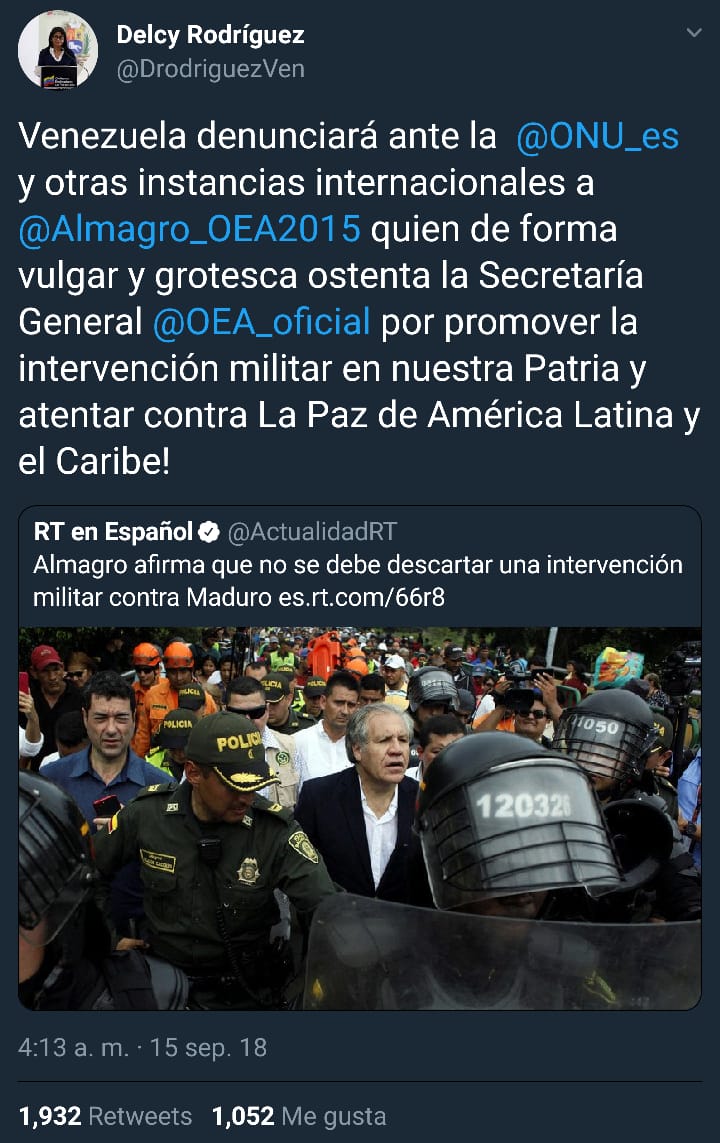 Mediante el comunicado del medio día de este lunes 17 de septiembre, la compañera Rosario Murillo, Vicepresidenta y coordinadora de comunicaciones de la republica de Nicaragua, dio lectura a un comunicado oficial donde condeno las declaraciones de Luis Almagro, Secretario General de la Organización de Estados Americanos (OEA), quien el pasado 14 de septiembre, en Colombia, expresó estar a favor de una acción militar intervencionista en contra del presidente de Venezuela Nicolás Maduro.