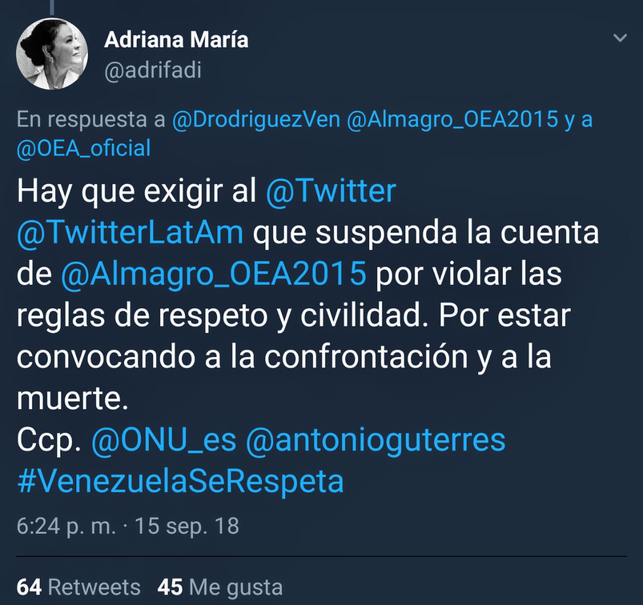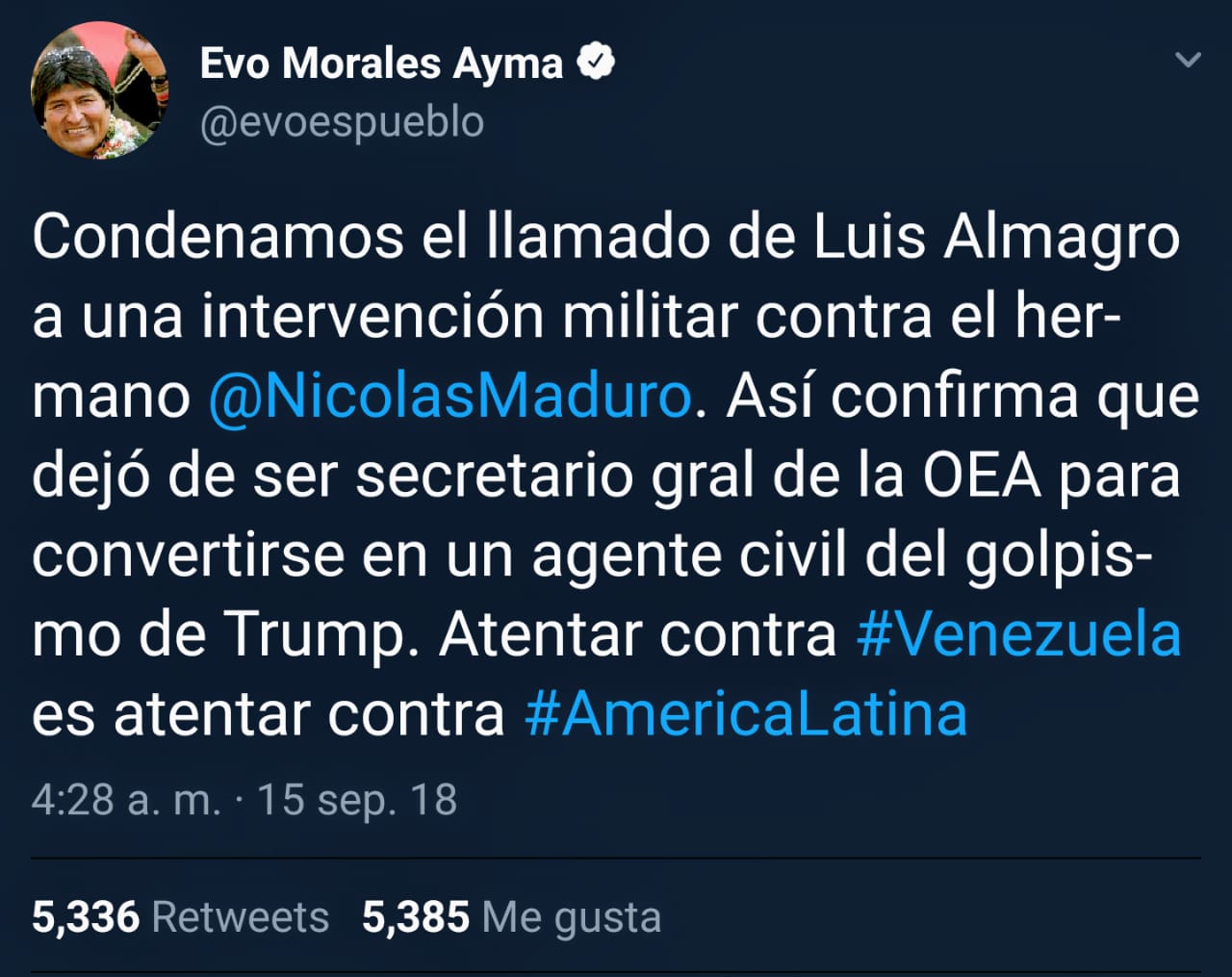 “Condenamos el llamado de Luis Almagro a una intervención militar contra el hermano Nicolas Maduro. Así confirma que dejó de ser secretario Gral de la OEA para convertirse en un agente civil del golpismo de Trump. Atentar contra #Venezuela es atentar contra #AméricaLatina” expresó el Presidente Bolivariano Evo Morales.