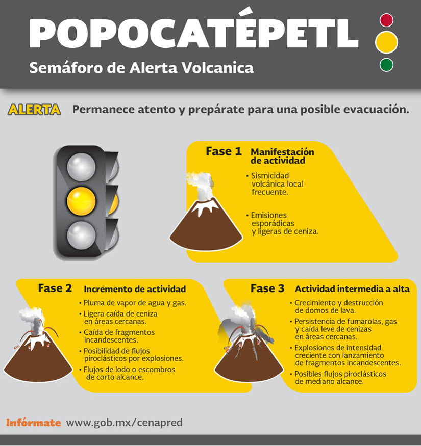 Según las autoridades, actualmente el Popocatépetl se encuentra en Amarillo Fase 2 en el semáforo de alerta volcánica. Esta etapa –incremento de actividad- supone pluma de vapor de agua y gas, ligera caída de ceniza en áreas cercanas, precipitación de fragmentos incandescentes, posibilidad de flujos piroclásticos por explosiones, así como de lodo o escombros de corto alcance.