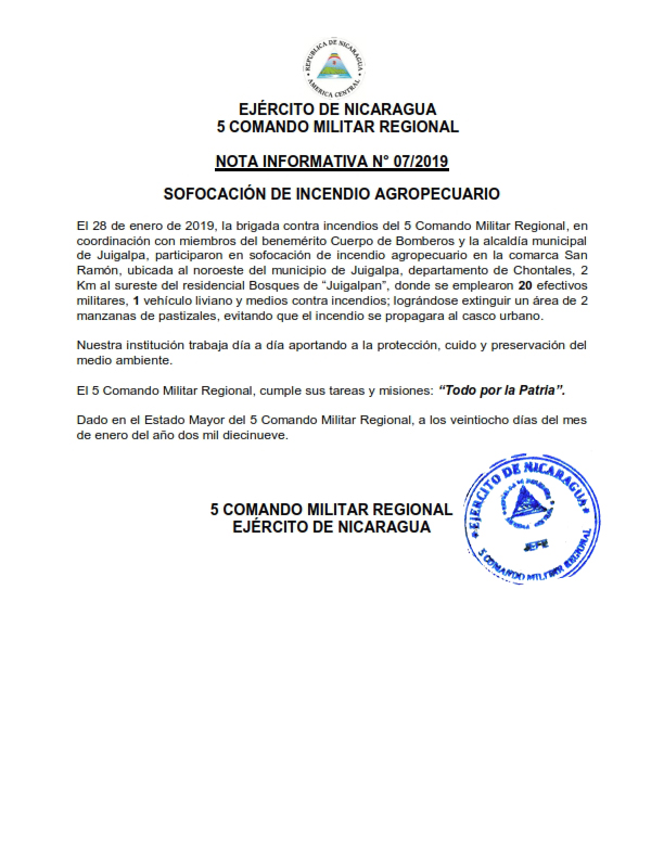 El 28 de enero de 2019, la brigada contra incendios del 5 Comando Militar Regional, en coordinación con miembros del benemérito Cuerpo de Bomberos y la alcaldía municipal de Juigalpa, participaron en sofocación de incendio agropecuario en la comarca San Ramón, ubicada al noroeste del municipio de Juigalpa, departamento de Chontales, 2 Km al sureste del residencial Bosques de “Juigalpan”, donde se emplearon20 efectivos militares, 1 vehículo liviano y medios contra incendios; lográndose extinguir un área de 2 manzanas de pastizales, evitando que el incendio se propagara al casco urbano.