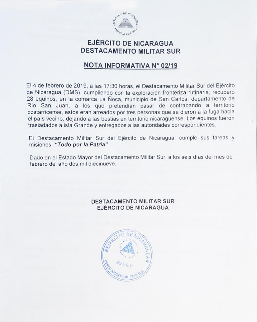 El 4 de febrero de 2019, a las 17:30 horas, el Destacamento Militar Sur del Ejército de Nicaragua (DMS), cumpliendo con la exploración fronteriza rutinaria, recuperó 28 equinos, en la comarca La Ñoca, municipio de San Carlos, departamento de Río San Juan, a los que pretendían pasar de contrabando a territorio costarricense. Estos eran arreados por tres personas que se dieron a la fuga hacia el país vecino, dejando a las bestias en territorio nicaragüense. Los equinos fueron trasladados a Isla Grande y entregados a las autoridades correspondientes.
