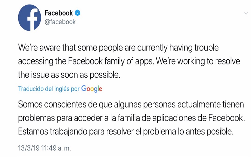 Empecemos por lo básico, el pasado miércoles 13 de marzo, día en el que se dió el colapso; Facebook tuitea (nótese la ironía) lo siguiente: