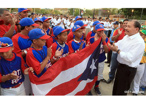Muchachos de Puerto Rico y Nicaragua, Capita-nes, por favor. Inicialmente, el Capitán del Equipo de Puerto Rico entregará al Comandante Daniel Ortega, una Medalla de Reconocimiento por su gran Apoyo al Deporte nicaragüense, y a este Béisbol Infantil, que tantas alegrías nos está dando. Nelson Rodríguez Sintrón, entrega la Medalla.