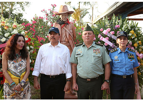 En este día del Cumpleaños de nuestro General Sandino, nuestro Saludo, nuestro Amor, nuestro Cariño para Blanca, la madre de estos jóvenes. Aquí están los tres hijos de Blanca... Rosario, que es sobrina-nieta de Sandino; y luego, el Alcalde, el General, Aminta, el Estado Mayor del Ejército, el Estado Mayor de la Policía Nacional, toda esta Juventud, todo este Pueblo ¡somos hij@s de Sandino!