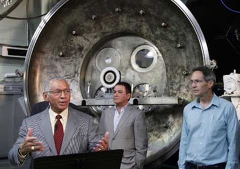 Durante su visita, Bolden vio un modelo de ingeniería del motor y observó a través de una portilla de una cámara al vacío que alberga el prototipo.
