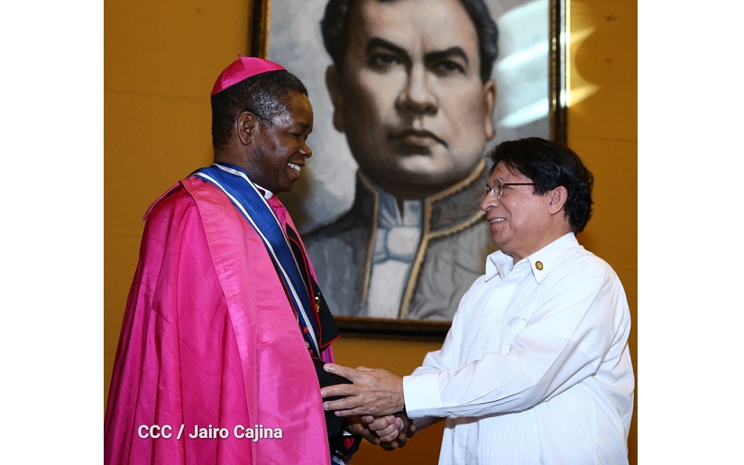 El canciller Denis Moncada Colindres, Ministro de Relaciones Exteriores, entregó la Orden José de Marcoleta en Grado de Gran Cruz, al Nuncio Apostólico Monseñor Fortunatus Nwachukwu, por desarrollar durante su labor una gestión humanística relevante en pro del fortaleciendo de las fraternas relaciones entre Nicaragua y la Santa Sede.