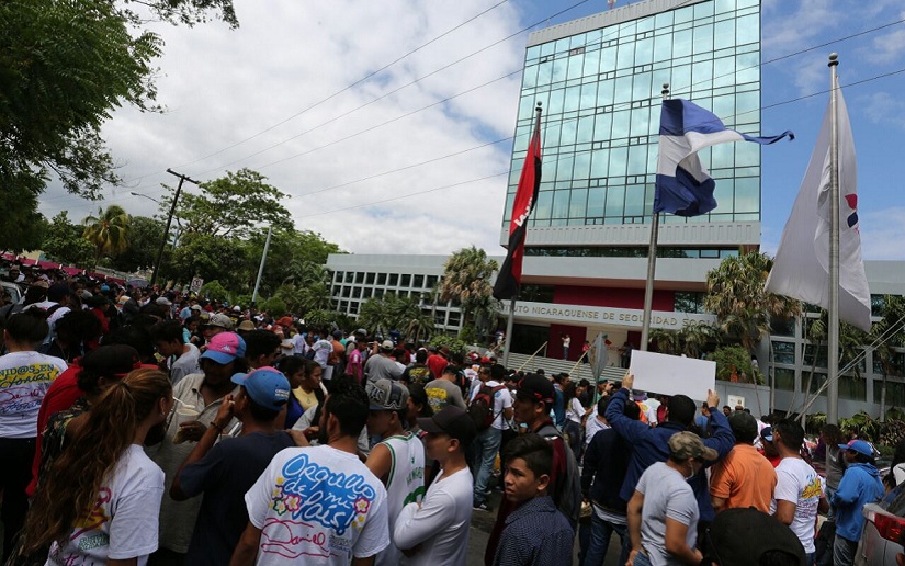 Los diferentes movimientos juveniles que conforman la Juventud Sandinista 19 de Julio se hicieron presentes frente al edificio del Instituto Nicaragüense de Seguridad Social (INSS) en respaldo a las medidas tomadas para la estabilidad del Seguro Social.