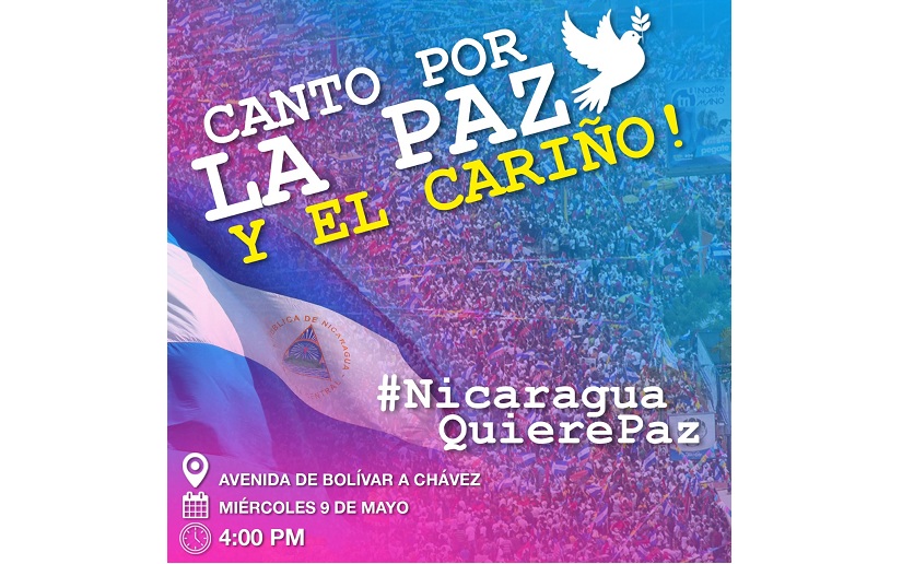 La Vicepresidenta Compañera Rosario Murillo, invitó a las familias nicaragüenses a participar la tarde de este miércoles en el Canto por la Paz y el Cariño, en la Avenida de Bolívar a Chávez, desde donde se realizarán oraciones y un concierto para clamar por la convivencia pacífica en Nicaragua.