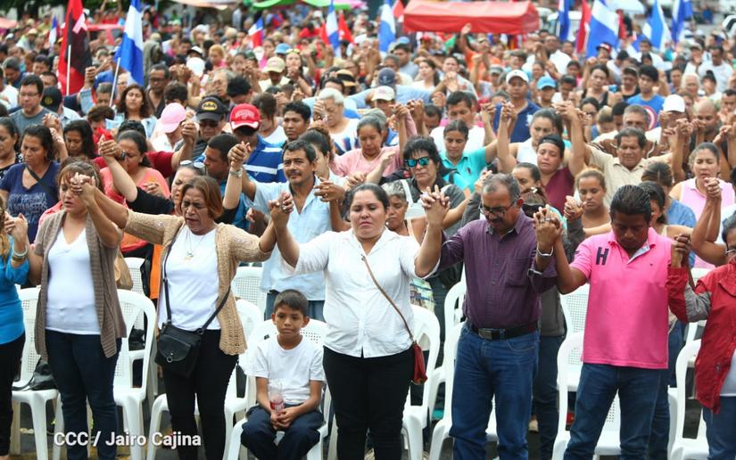 “Esfuércense por mantener la unidad del Espíritu mediante el vínculo de la paz.  Hay un solo cuerpo y un solo Espíritu, así como también fueron llamados a una sola esperanza”, fue parte de la palabra de Dios que esta tarde alimentó a los nicaragüenses, que asistieron a la cadena de oración que se celebra todos los domingos en la Avenida de Bolívar a Chávez.