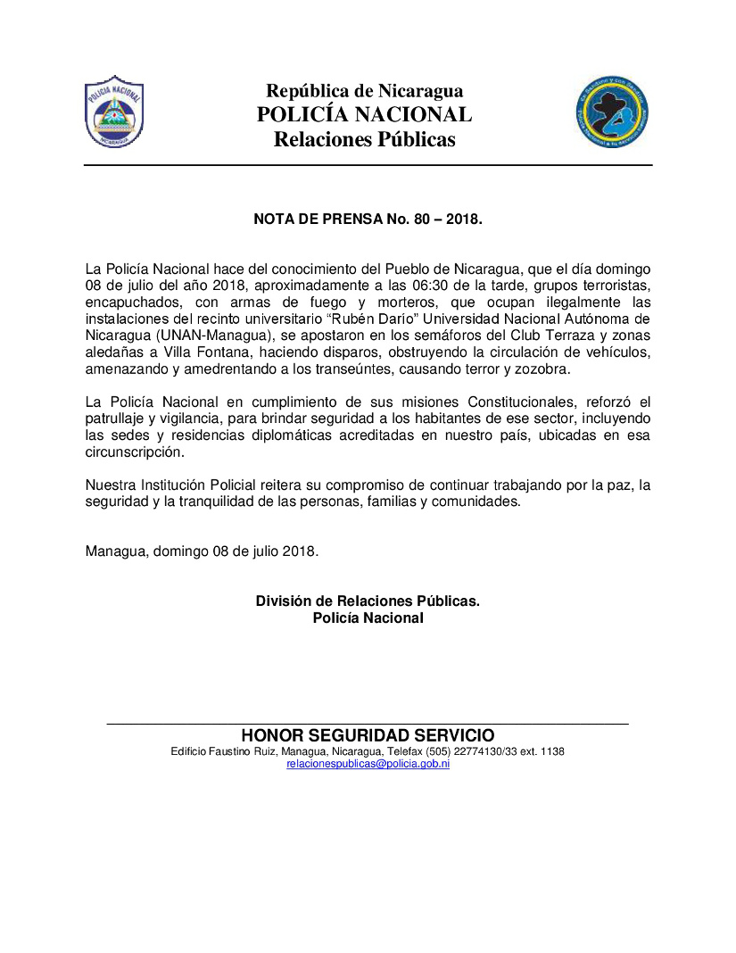 La Policía Nacional hace del conocimiento del Pueblo de Nicaragua, que el día domingo 08 de julio del año 2018, aproximadamente a las 06:30 de la tarde, grupos terroristas, encapuchados, con armas de fuego y morteros, que ocupan ilegalmente las instalaciones del recinto universitario “Rubén Darío” Universidad Nacional Autónoma de Nicaragua (UNAN-Managua), se apostaron en los semáforos del Club Terraza y zonas aledañas a Villa Fontana, haciendo disparos, obstruyendo la circulación de vehículos, amenazando y amedrentando a los transeúntes, causando terror y zozobra.
