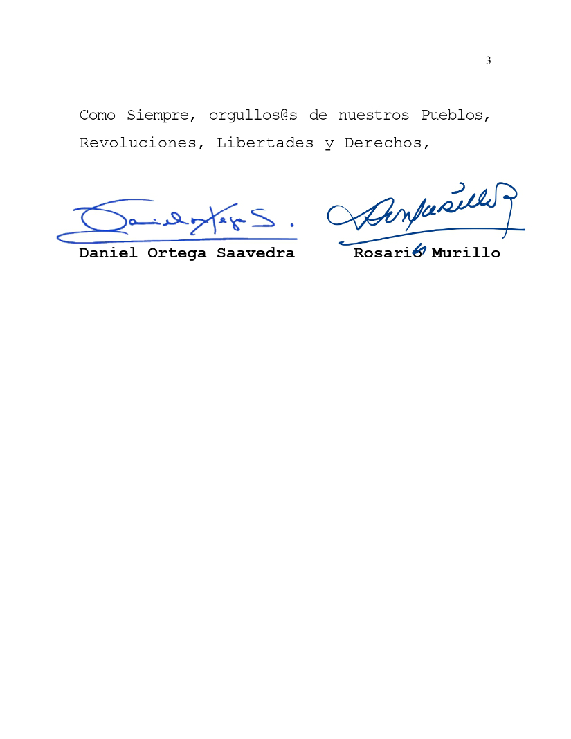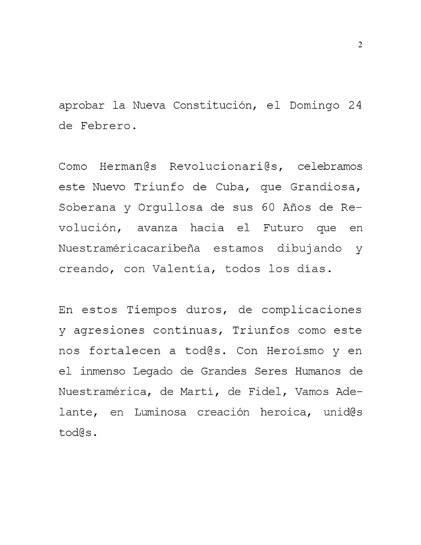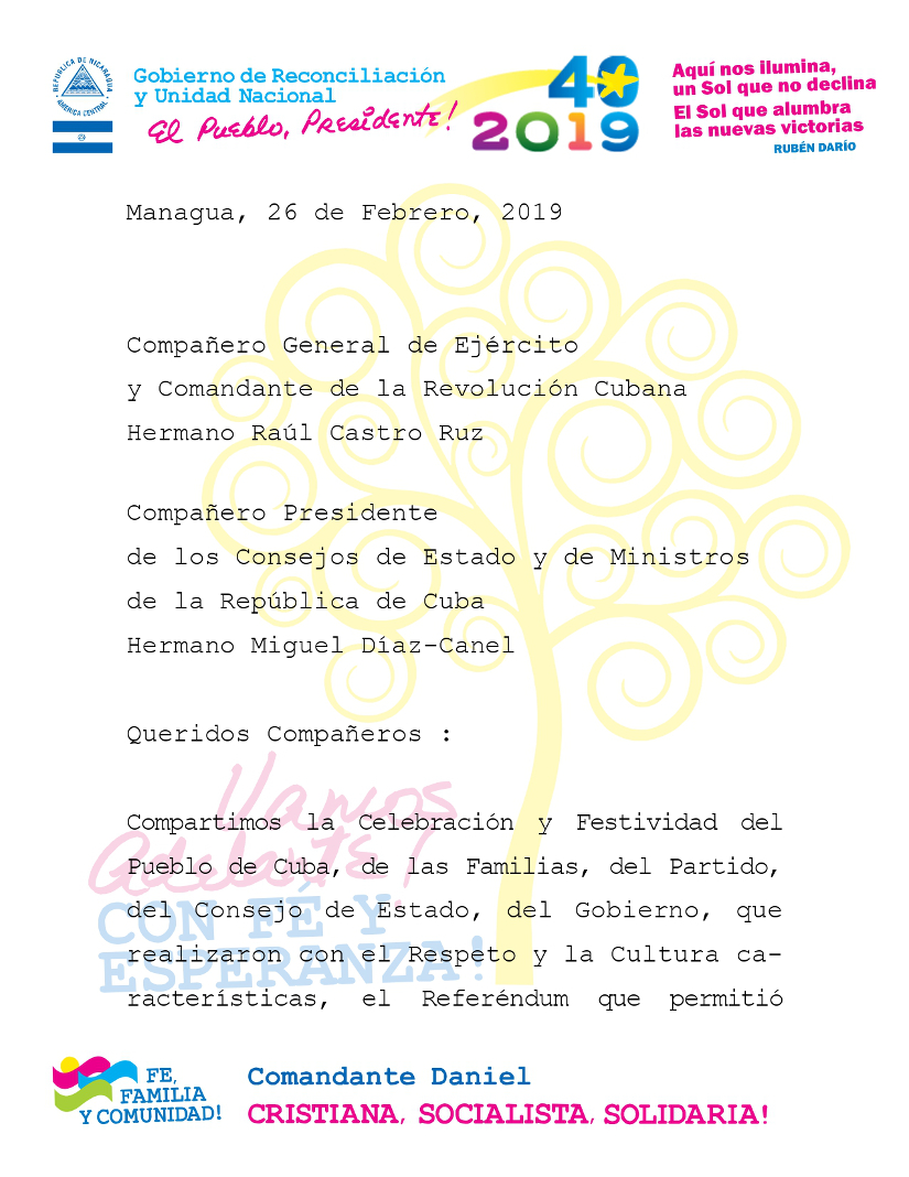 Mensaje del presidente-comandante Daniel Ortega, y de la compañera Rosario Murillo, a los Compañeros general de ejército y comandante de la Revolución Cubana, Raúl Castro Ruz, y al presidente de los Consejos de Estado y de Ministros de la República de Cuba, Miguel Díaz-Canel, por el triunfo en el Referéndum que permitió aprobar la nueva constitución, el domingo 24 de febrero.