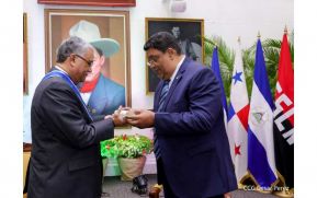 El Gobierno de Reconciliación y Unidad Nacional a través del Canciller Valdrack Jaentschke condecoró con la Orden José de Marcoleta en Grado de Gran Cruz al Excelentísimo Sr. José de Jesús Martínez, Embajador Extraordinario y Plenipotenciario de Panamá.