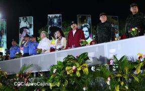 El Presidente de Nicaragua, Comandante Daniel Ortega, y la Vicepresidenta, Compañera Rosario Murillo, presiden junto al Comandante en Jefe del Ejército de Nicaragua, General de Ejército Julio César Avilés , el Desfile Militar de Nuestro Pueblo Ejército.