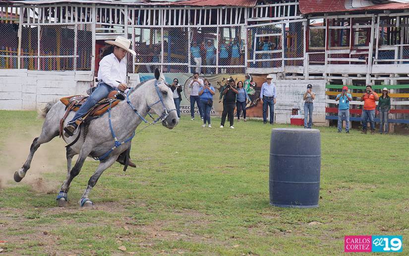 Aishlyn Silvana Álvarez acelera su caballo a toda velocidad, rodeando un trébol de barriles plantados en el centro del terreno de la barrera municipal de Juigalpa.