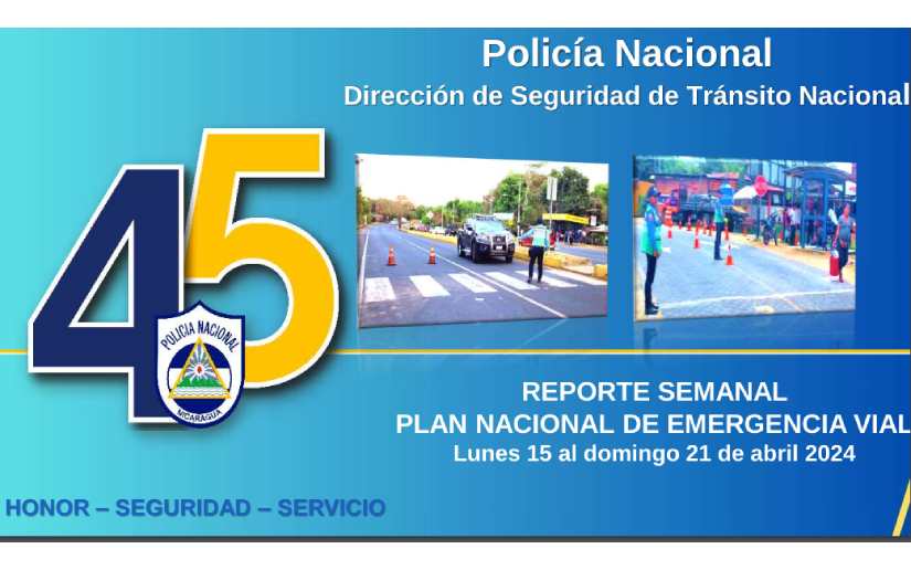 La Policía Nacional de Nicaragua presentó el reporte semanal del Plan Nacional de Emergencia Vial, correspondiente al período del lunes 15 al domingo 21 de abril de 2024.