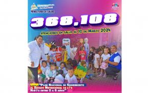 En cumplimiento a las actividades del Plan Nacional de “Seguimiento al Estado Nutricional de l@s Niñ@s entre 0 a 6 años”, al 10 de Marzo 2024, hemos brindado 368,108 atenciones, detalladas a continuación.