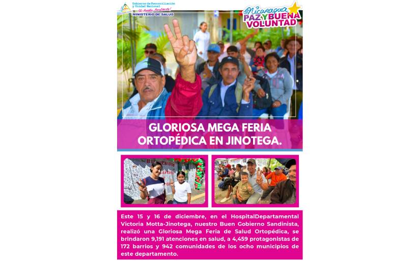 Este 15 y 16 de diciembre, en el Hospital Departamental Victoria Motta-Jinotega, nuestro Buen Gobierno Sandinista, realizó una Gloriosa Mega Feria de Salud Ortopédica, se brindaron 9,191 Atenciones en Salud.