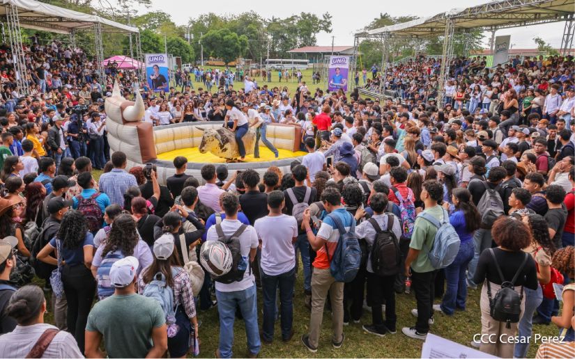 Con música al estilo “agropecuario”, la vestimenta con jeans, camisa, botas y sombrero, los estudiantes de la Universidad Nacional Agraria (UNA) de reingreso.