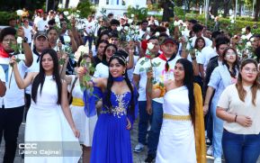 Una ceremonia llena de poesía, presentación de mosaicos gigantes, bandas rítmicas, entrega de ofrendas, entre otras expresiones artísticas, fue realizada por la Juventud Sandinista 19 de Julio.