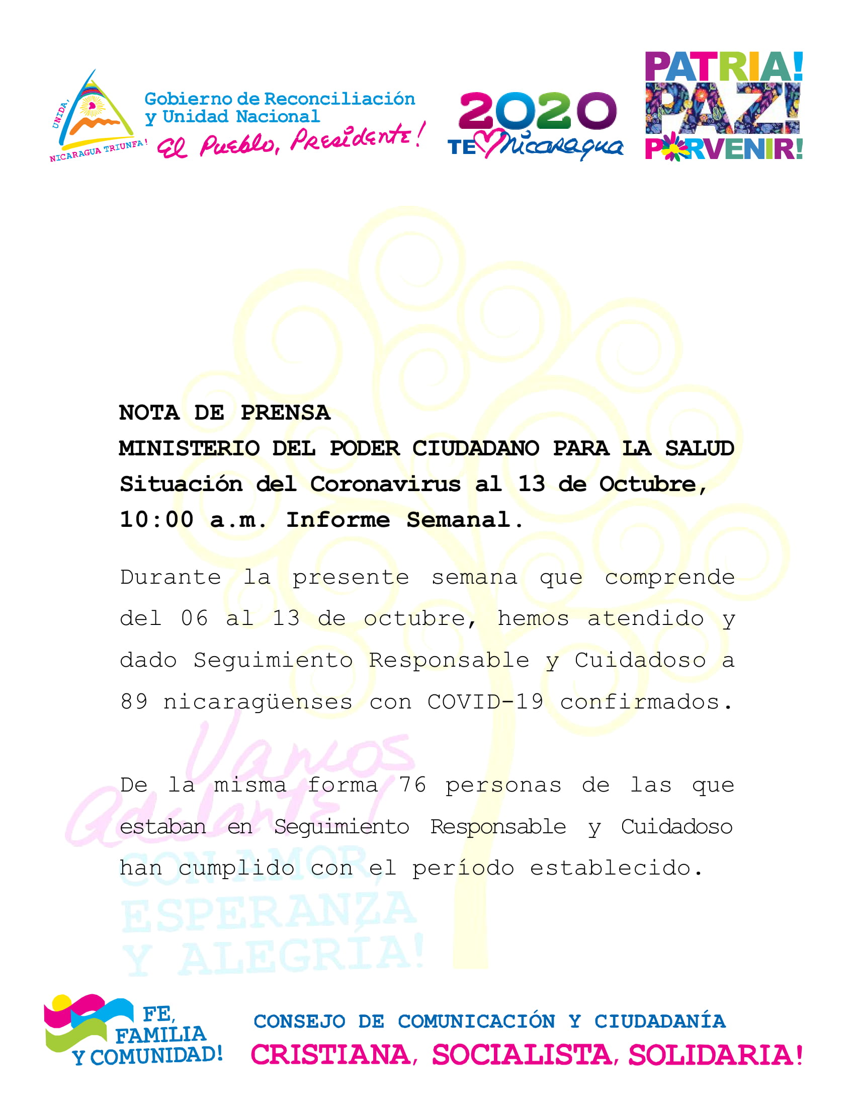 Durante la presente semana que comprende del 06 al 13 de octubre, hemos atendido y dado Seguimiento Responsable y Cuidadoso a 89 nicaragüenses con COVID-19 confirmados.