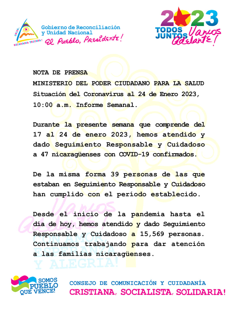 Durante la presente semana que comprende del 17 al 24 de enero 2023, hemos atendido y dado Seguimiento Responsable y Cuidadoso a 47 nicaragüenses con COVID-19 confirmados.