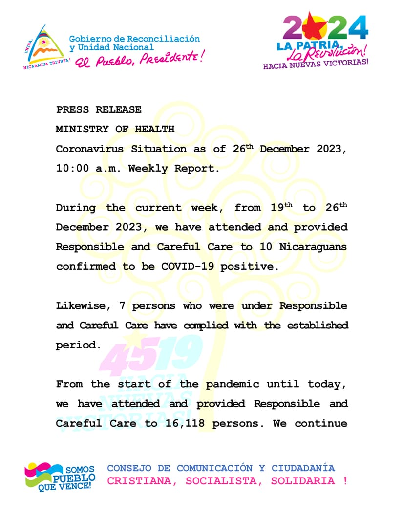 During the current week, from 19th to 26th December 2023, we have attended and provided Responsible and Careful Care to 10 Nicaraguans confirmed to be COVID-19 positive.