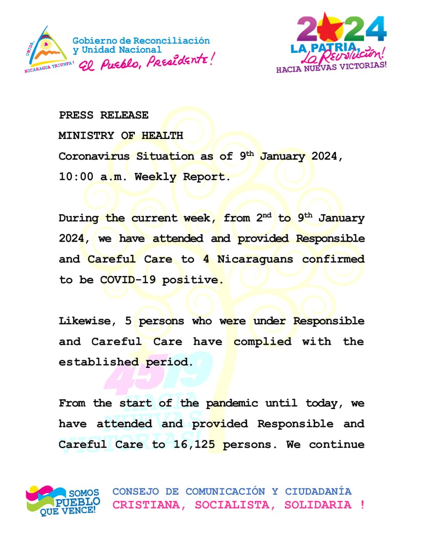 During the current week, from 2nd to 9th January 2024, we have attended and provided Responsible and Careful Care to 4 Nicaraguans confirmed to be COVID-19 positive.