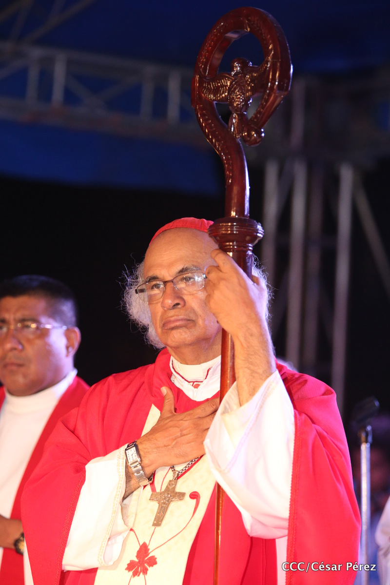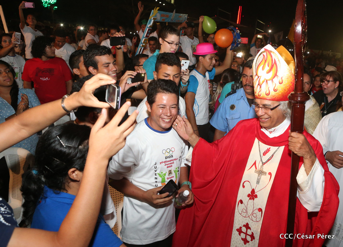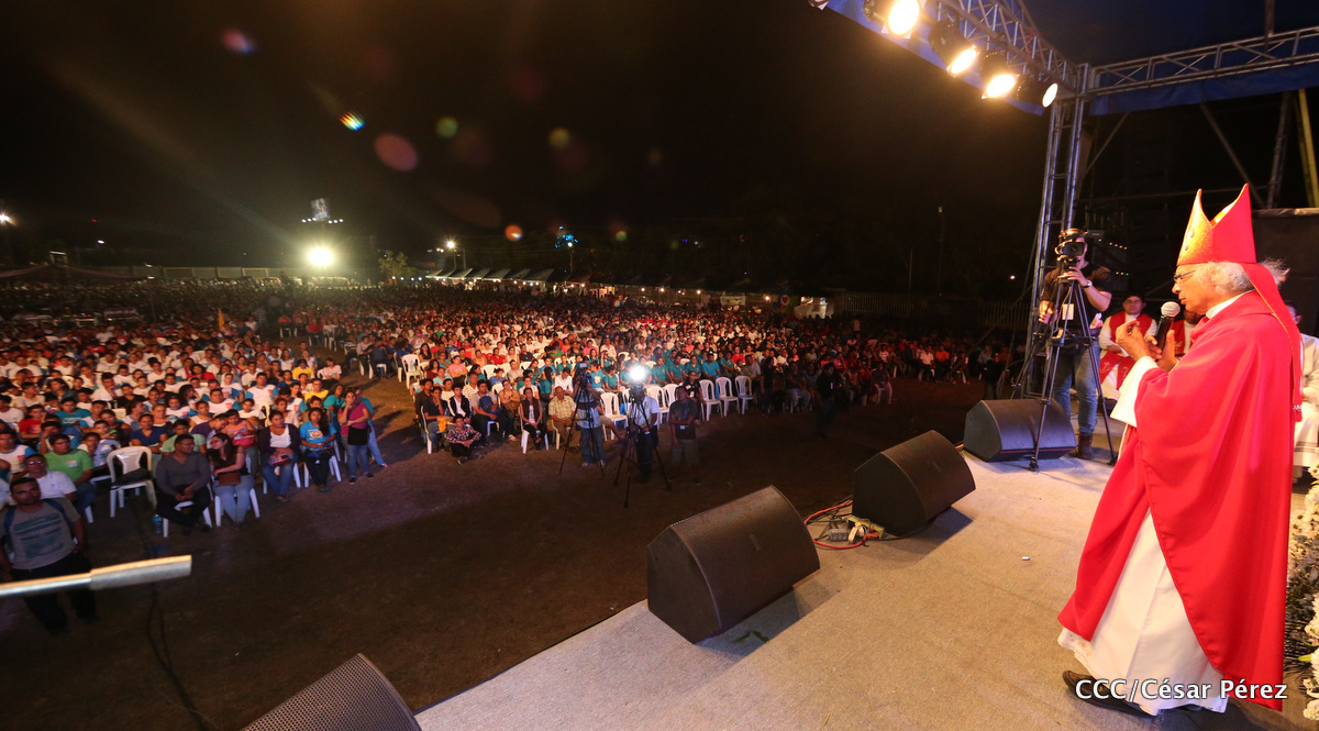 Miles de jóvenes católicos, le rindieron un efusivo homenaje la noche de este sábado a Su Eminencia Reverendísima, Cardenal Leopoldo Brenes, quien se encuentra celebrando su Undécimo Aniversario como Arzobispo de la Arquidiócesis de Managua, en el contexto de la XXIV Vigilia de Pentecostés Juvenil.