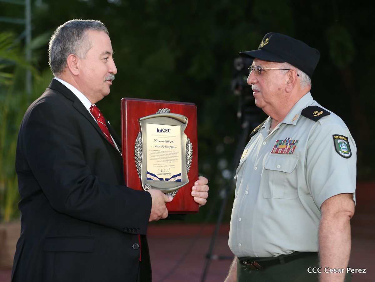 El Presidente de la República, Comandante Daniel Ortega Saavedra, la Compañera Rosario Murillo, Coordinadora del Consejo de Comunicación y Ciudadanía; y el Jefe del Ejército, General Julio César Avilés, encabezaron la tarde-noche de este viernes el 37 aniversario del Cuerpo Médico Militar.