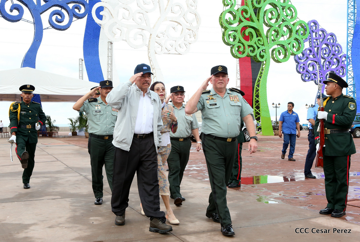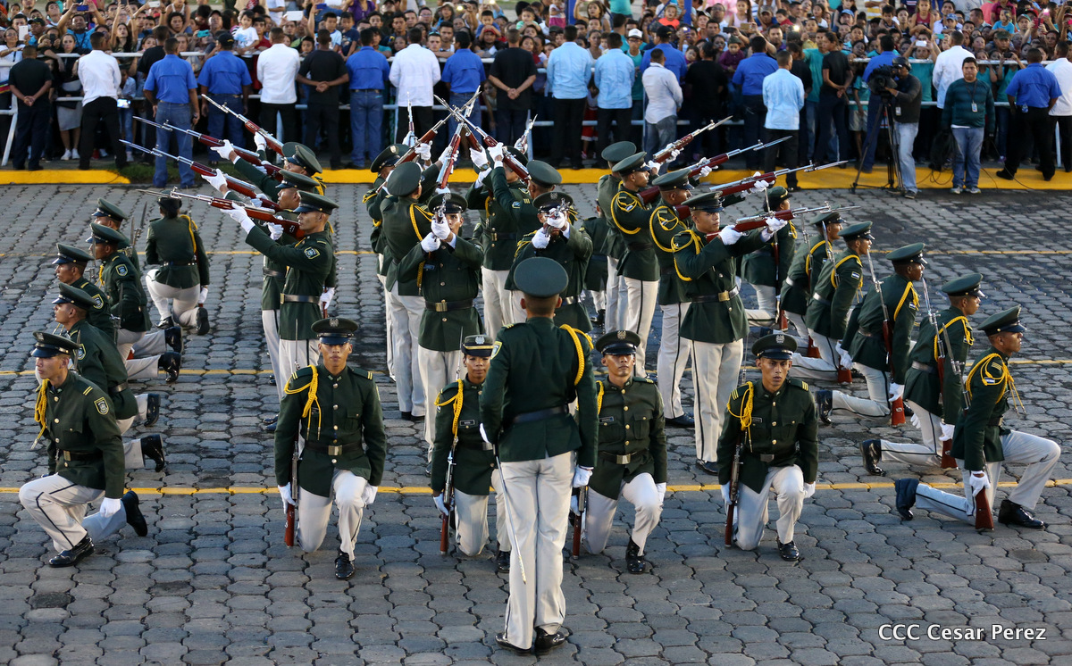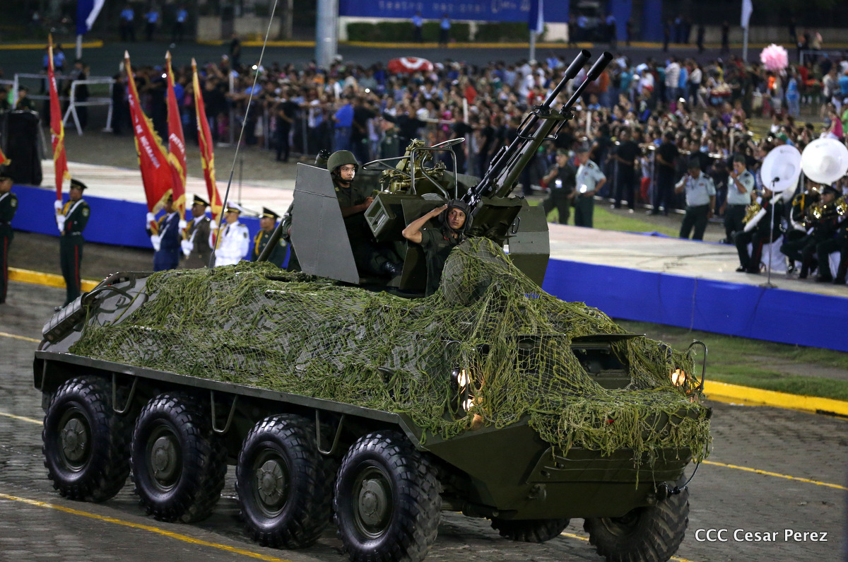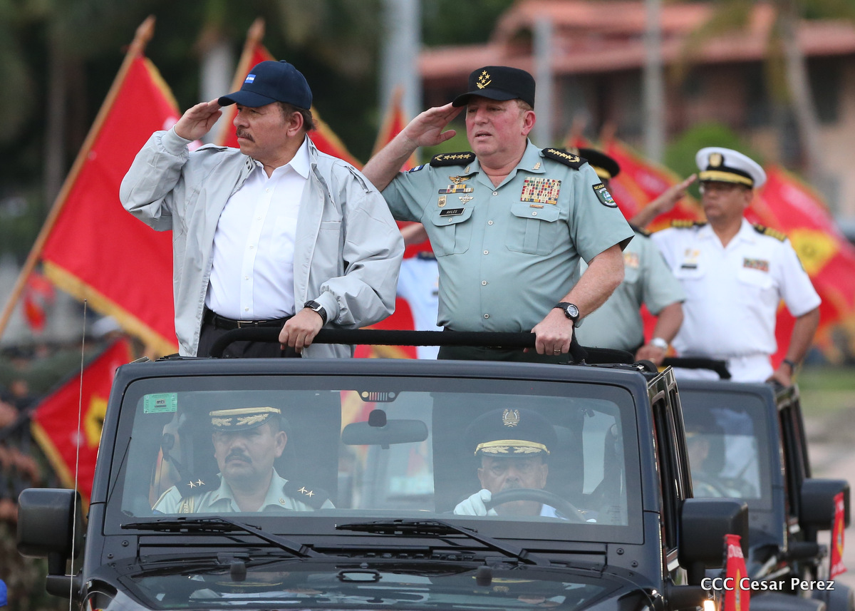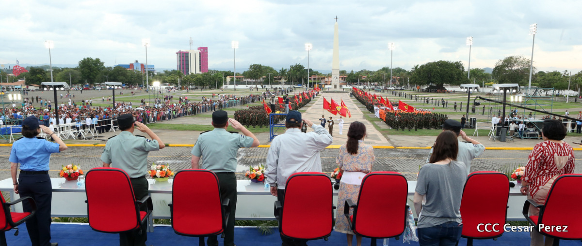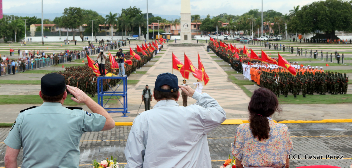 El Presidente de Nicaragua, Comandante Daniel Ortega Saavedra, y la Coordinadora del Consejo de Comunicación y Ciudadanía, Compañera Rosario Murillo, encabezaron este sábado el desfile militar en ocasión del 37 aniversario de la fundación de las fuerzas armadas de Nicaragua.