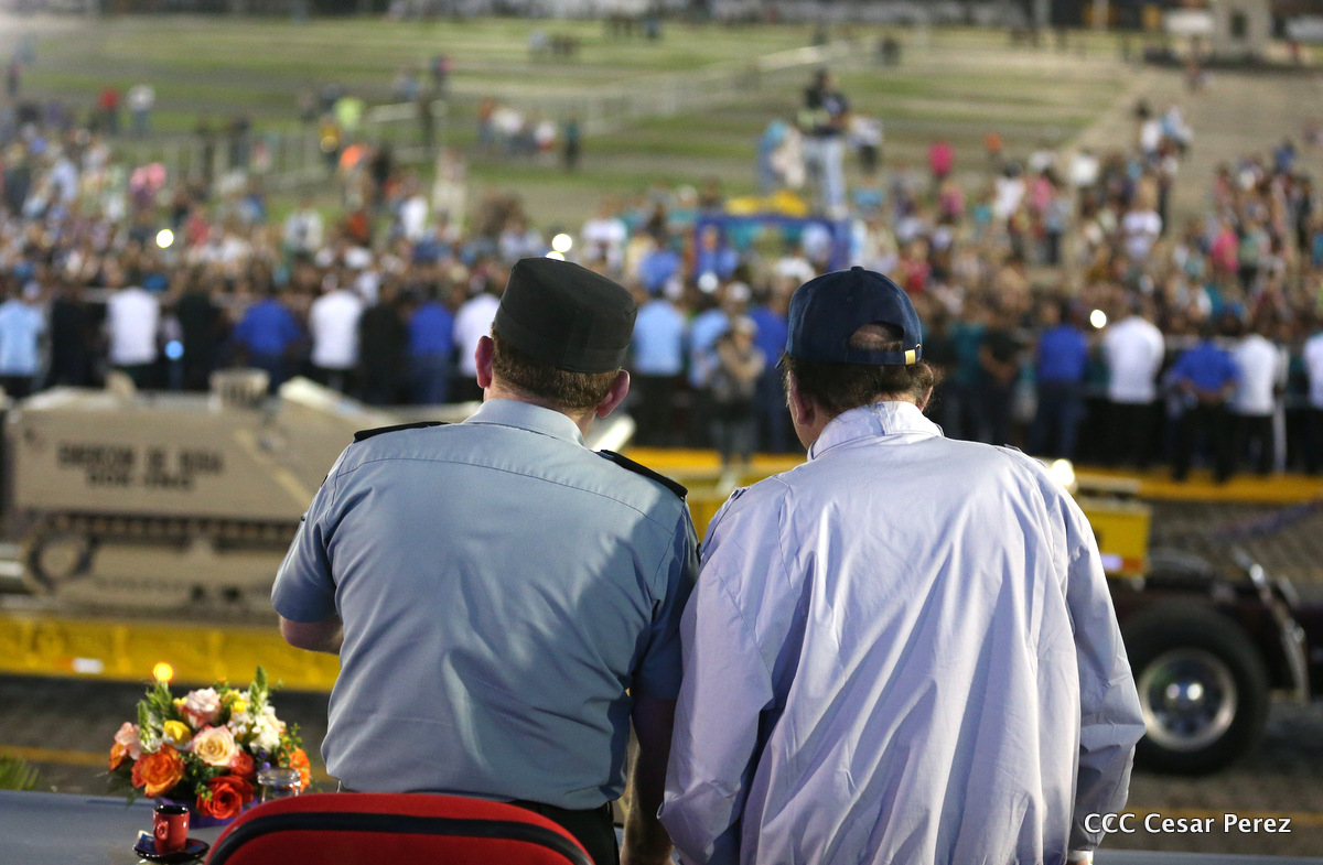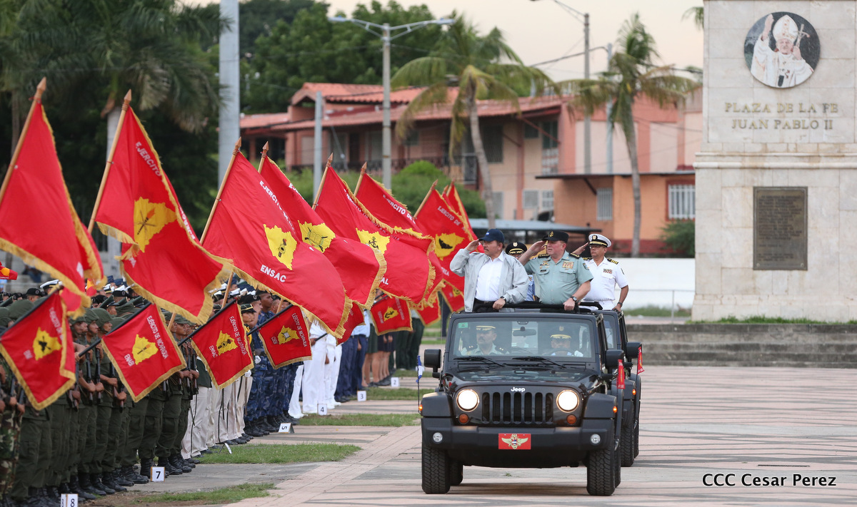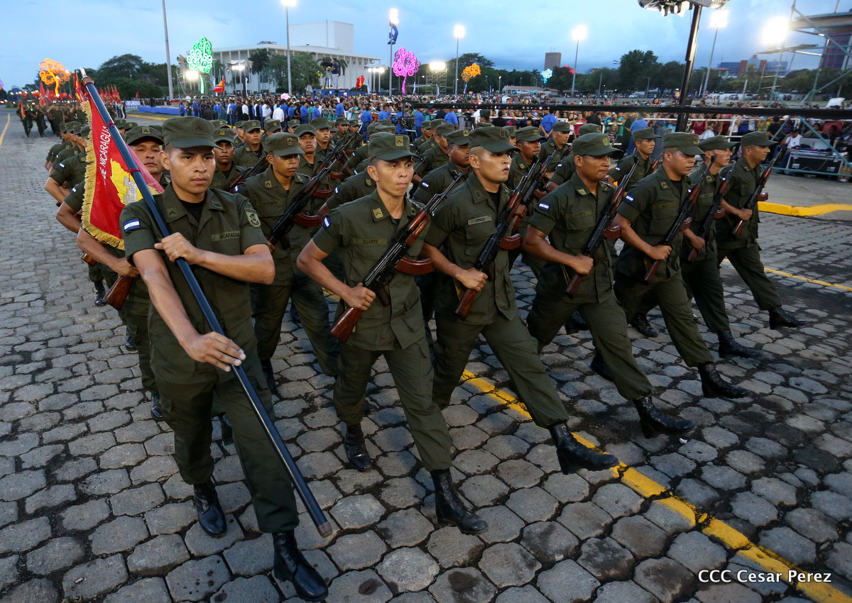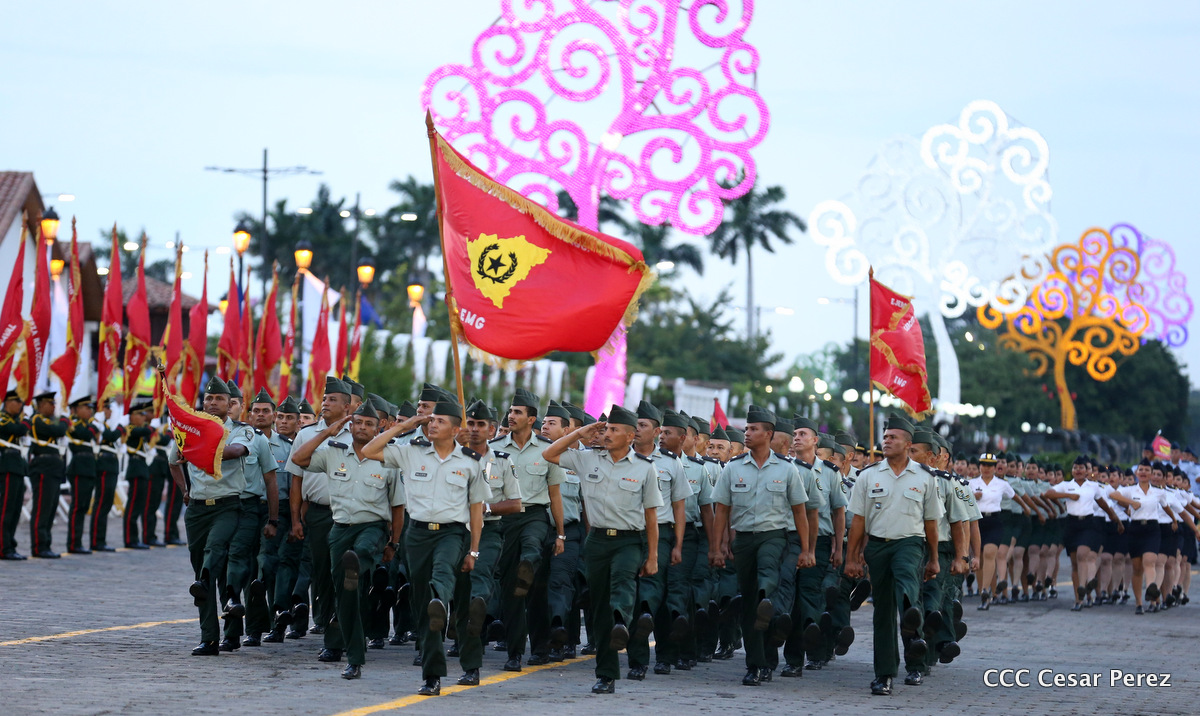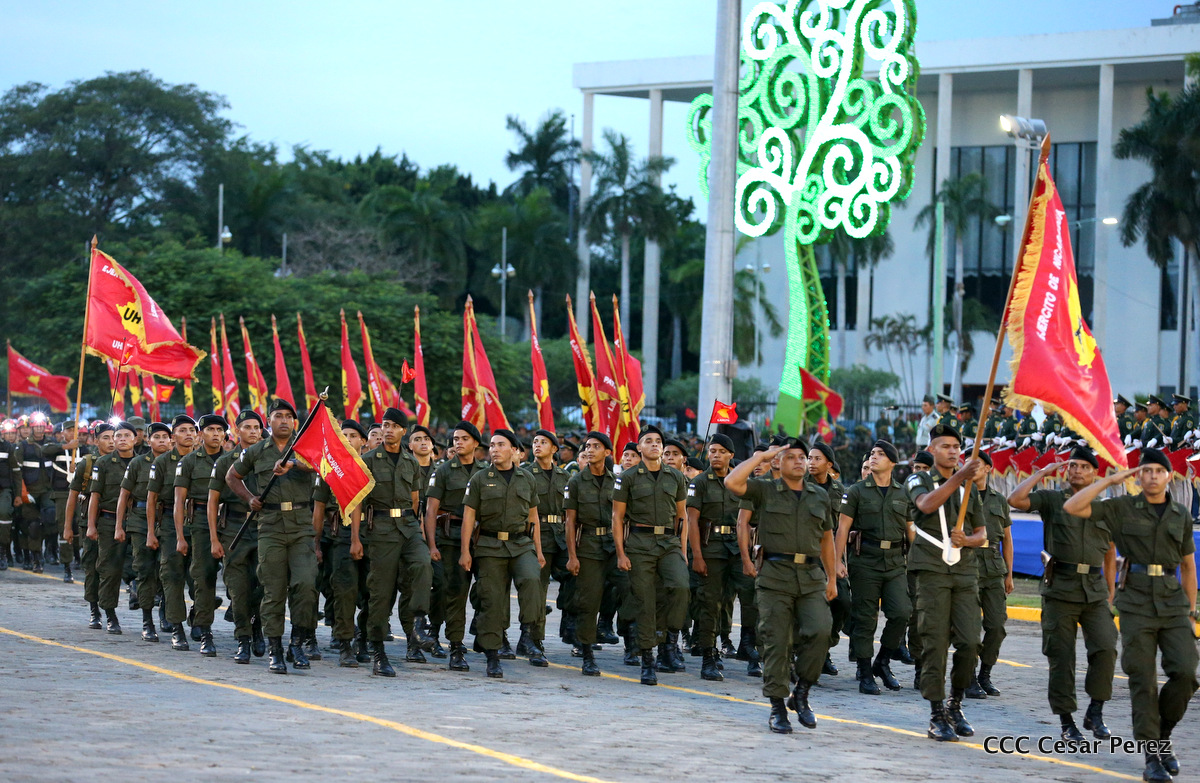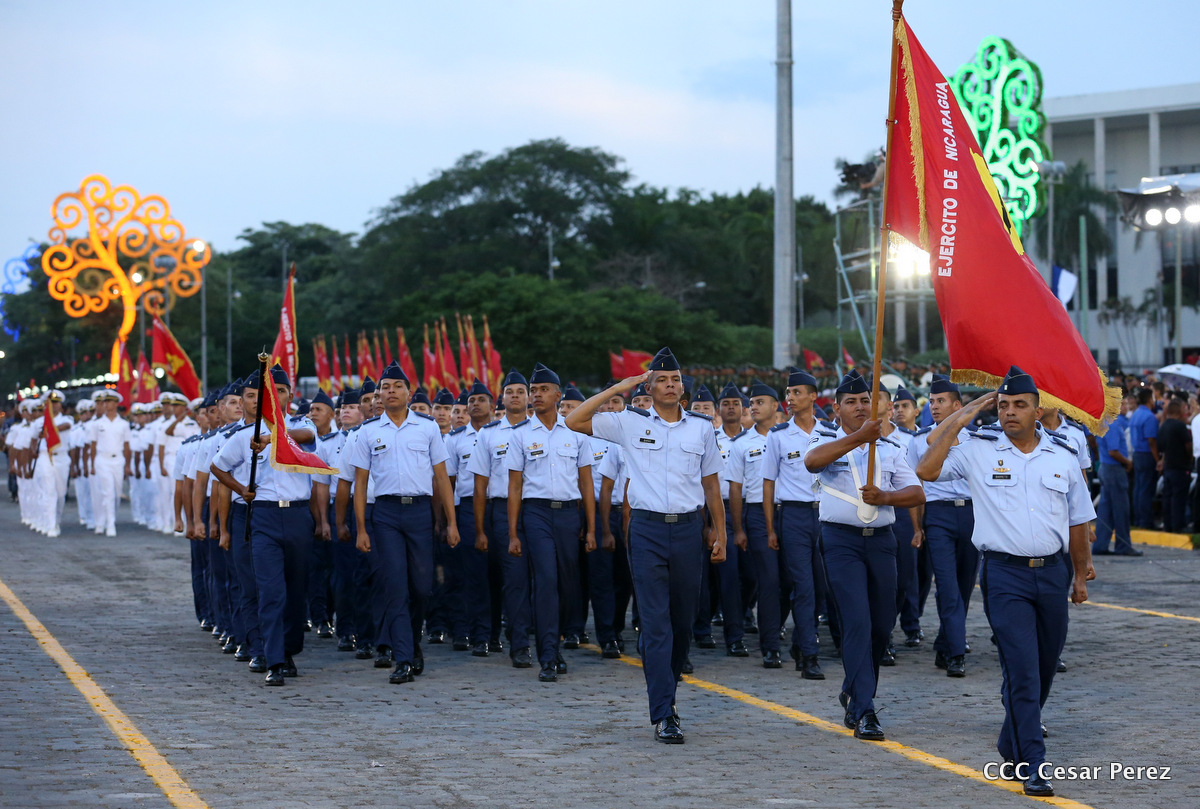El Presidente de Nicaragua, Comandante Daniel Ortega Saavedra, y la Coordinadora del Consejo de Comunicación y Ciudadanía, Compañera Rosario Murillo, encabezaron este sábado el desfile militar en ocasión del 37 aniversario de la fundación de las fuerzas armadas de Nicaragua.