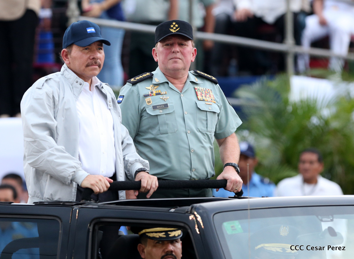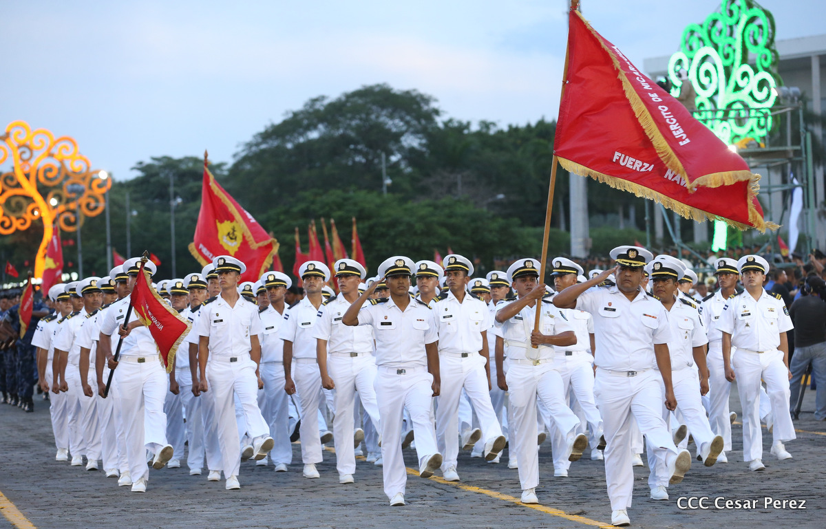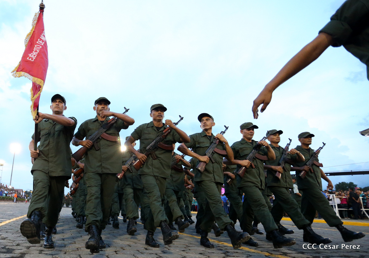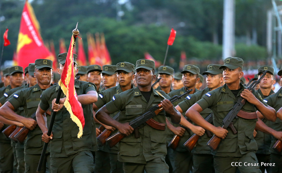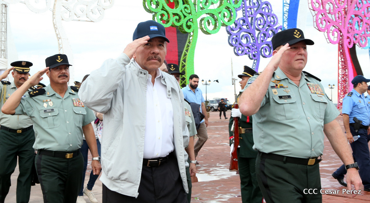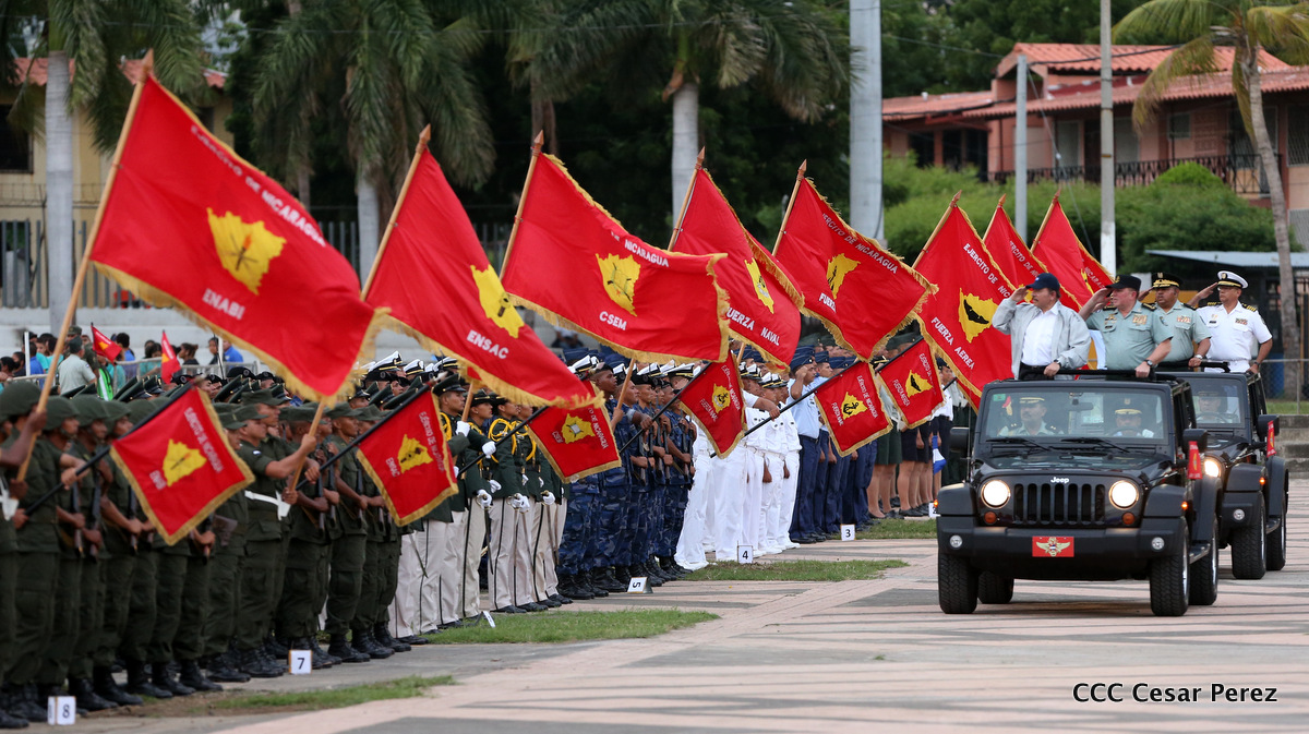 El Presidente de Nicaragua, Comandante Daniel Ortega Saavedra, y la Coordinadora del Consejo de Comunicación y Ciudadanía, Compañera Rosario Murillo, encabezaron este sábado el desfile militar en ocasión del 37 aniversario de la fundación de las fuerzas armadas de Nicaragua.