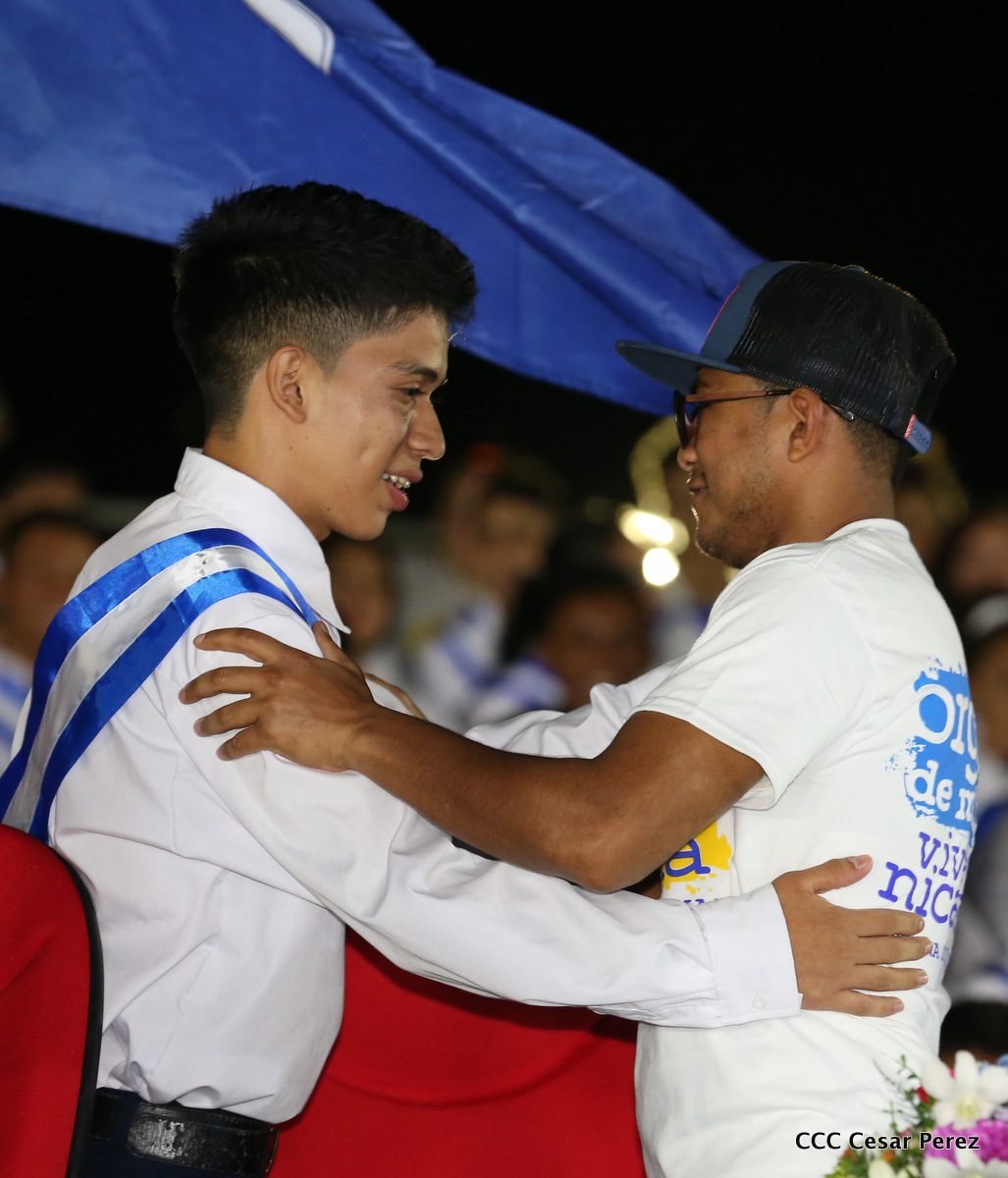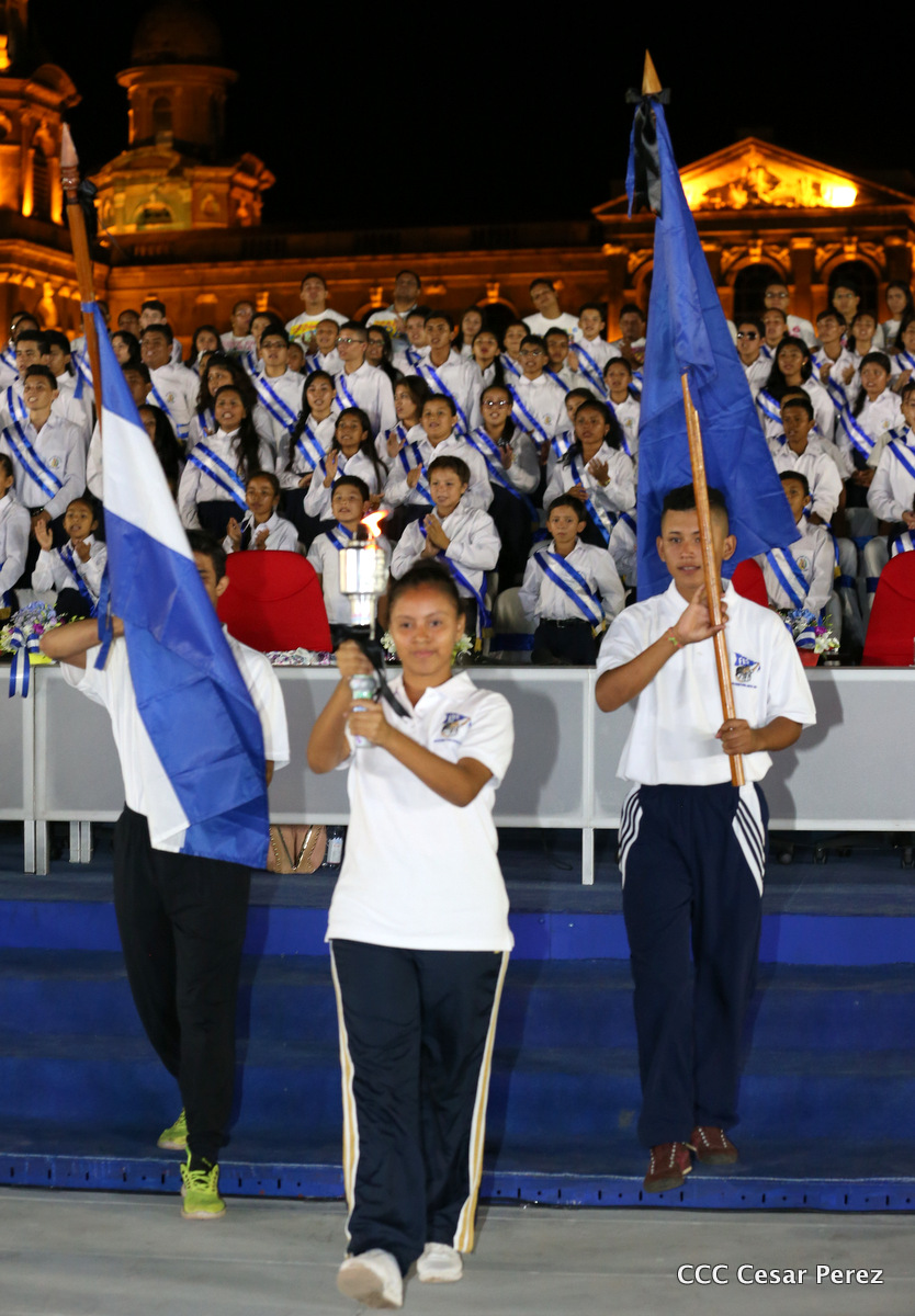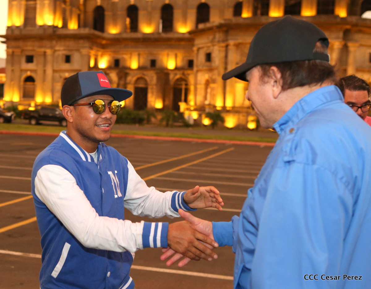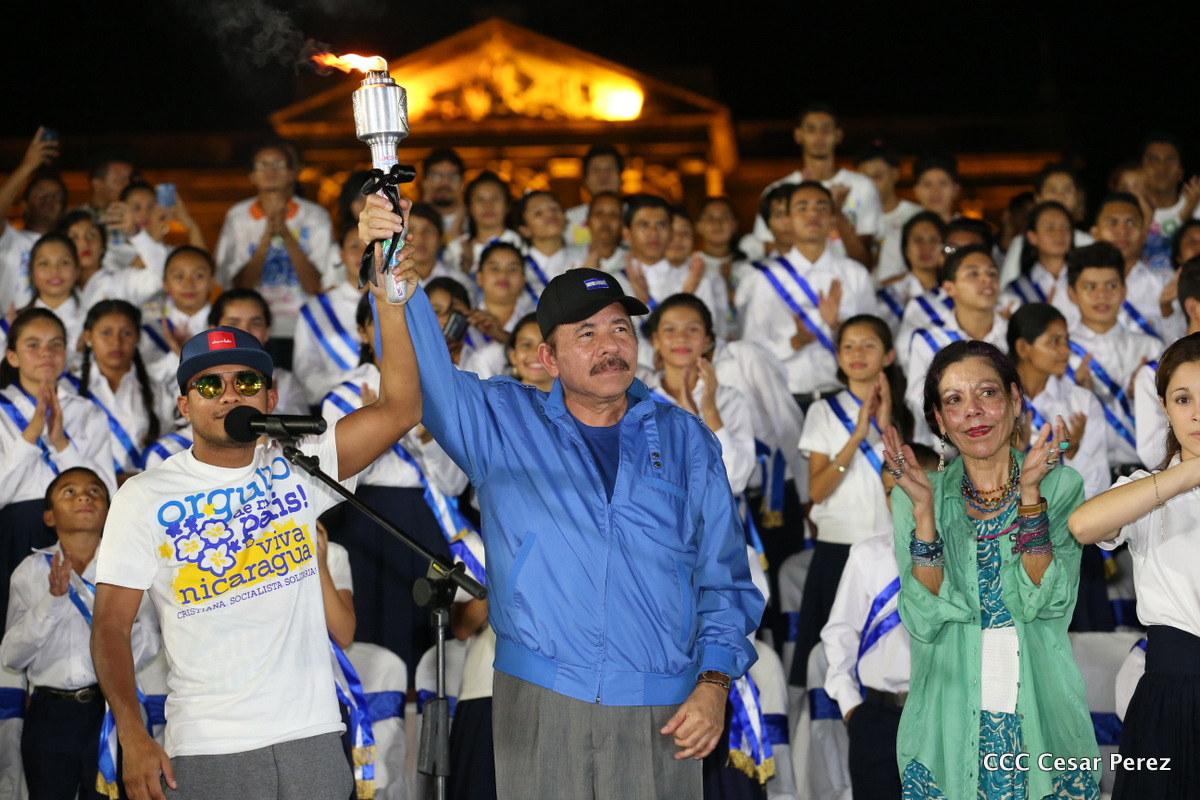 El Presidente de la República, Comandante Daniel Ortega, y la Coordinadora del Consejo de Comunicación y Ciudadanía, Compañera Rosario Murillo, recibieron este lunes de manos del tetracampeón mundial de boxeo, Román “Chocolate” González, la Antorcha de la Libertad y la Unidad Centroamericana.