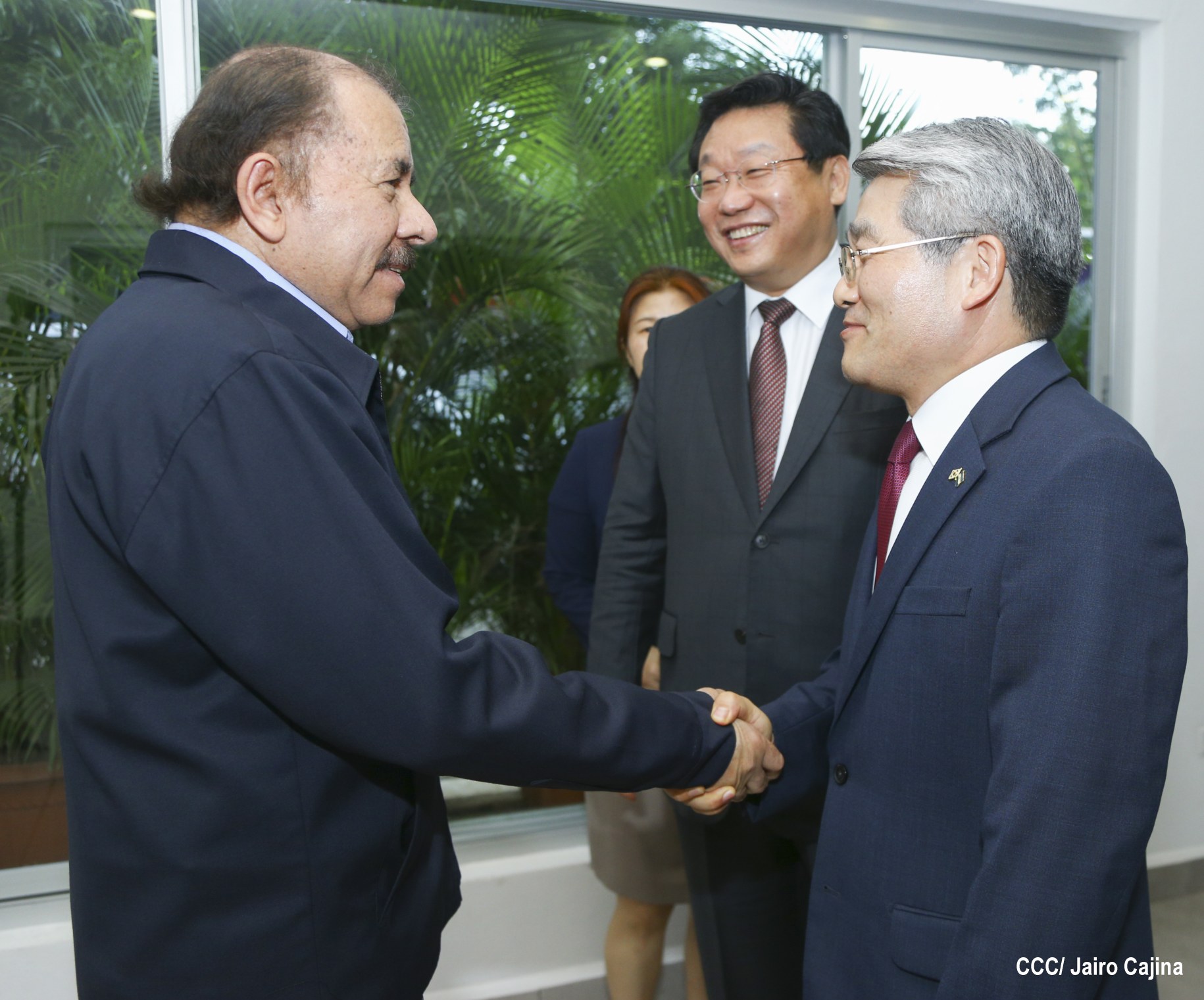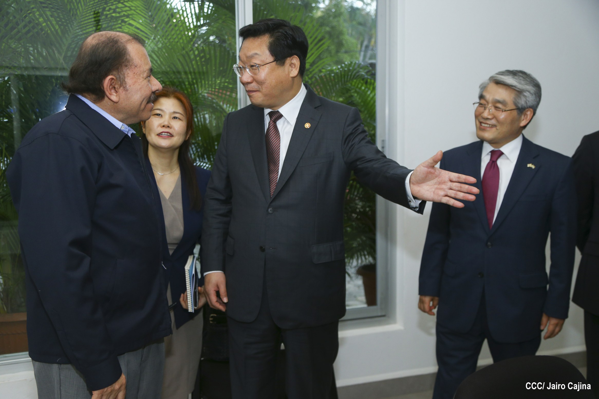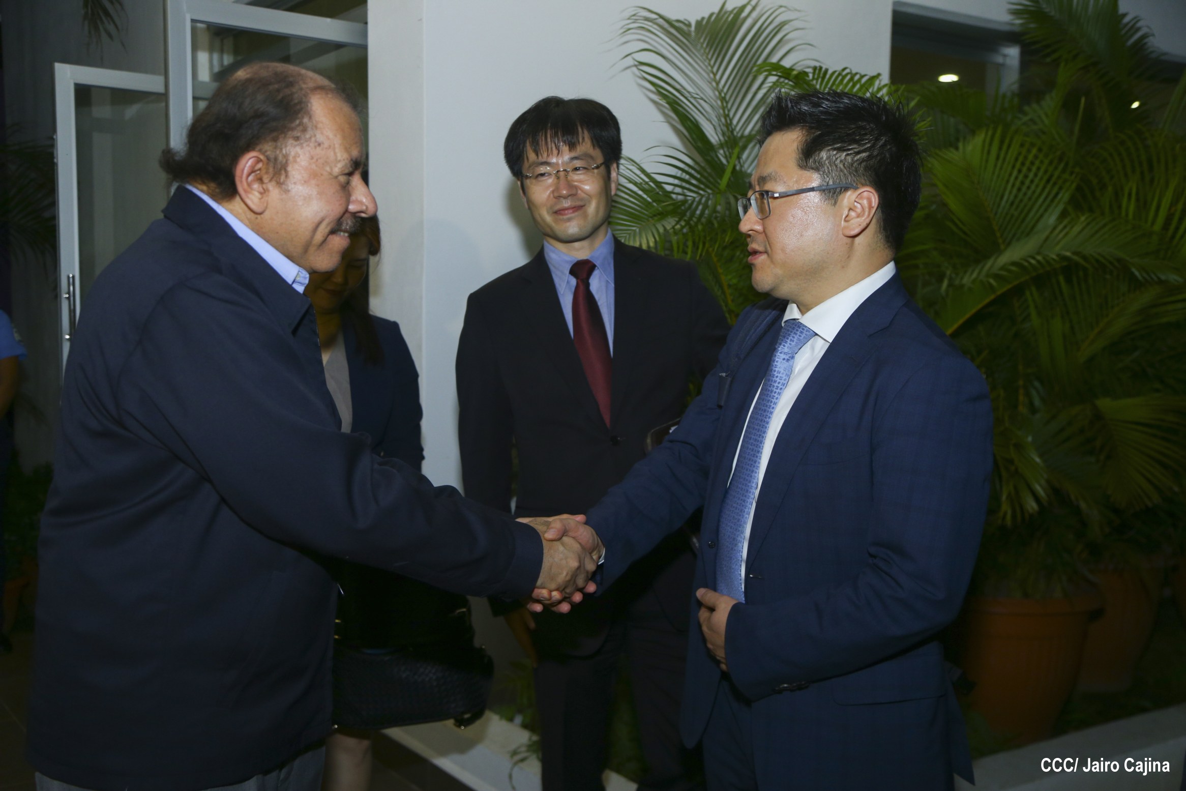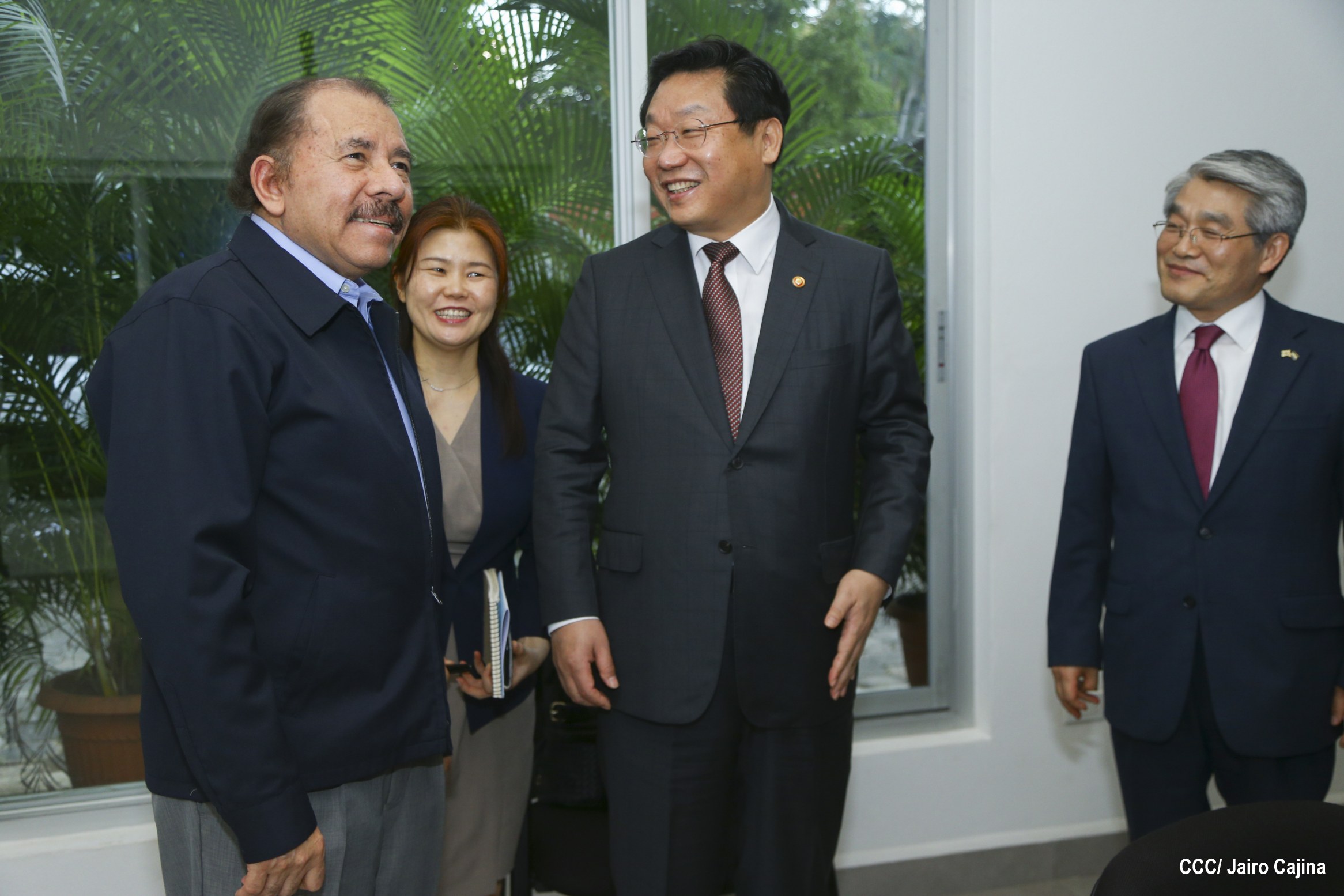 El Presidente de la República, Comandante Daniel Ortega Saavedra, se reunió con el Ministro de Comercio, Industria y Energía de Corea, señor Hyunghwan JOO, quien se encuentra en Nicaragua para anunciar la conclusión de las negociaciones del Tratado de Libre Comercio (TLC) entre Centroamérica y la República de Corea.