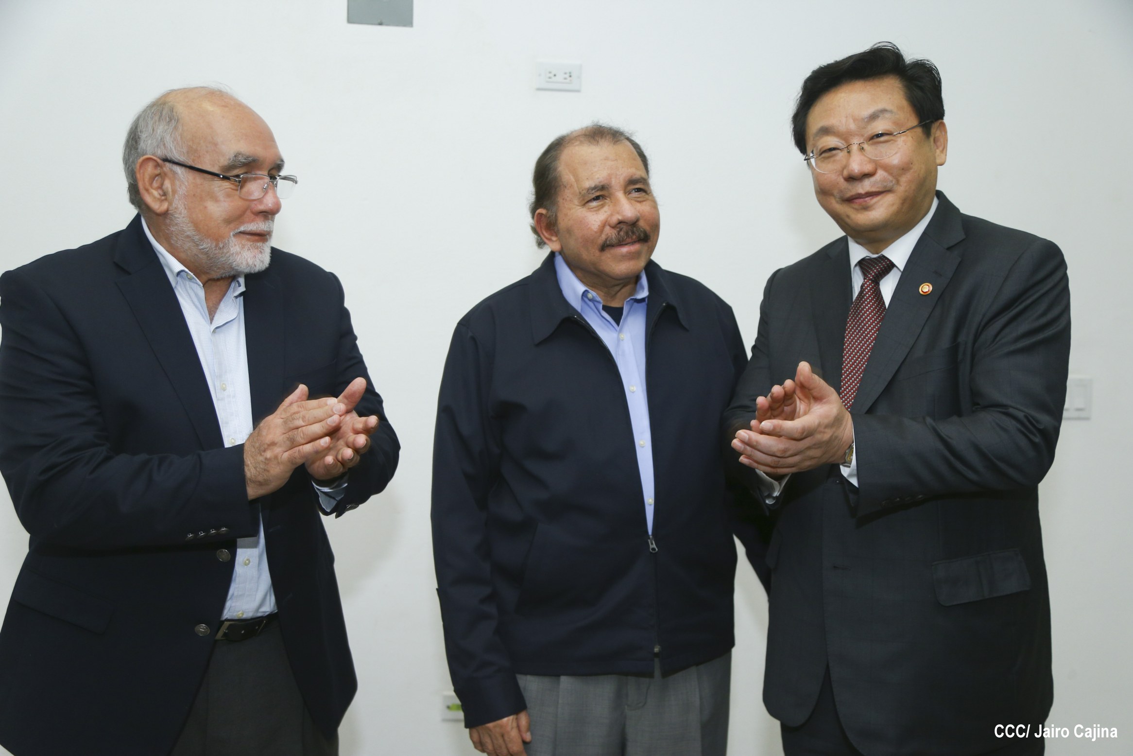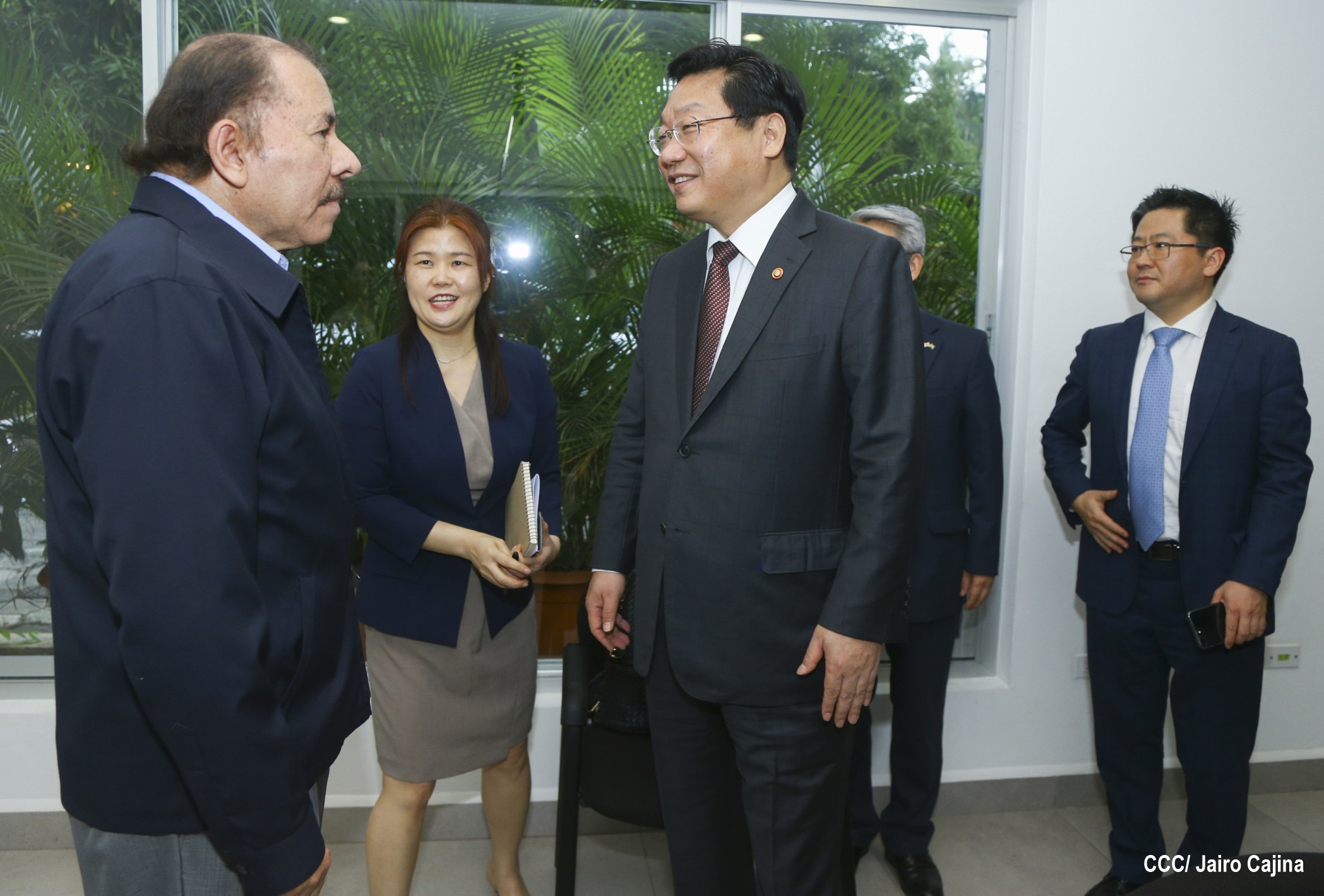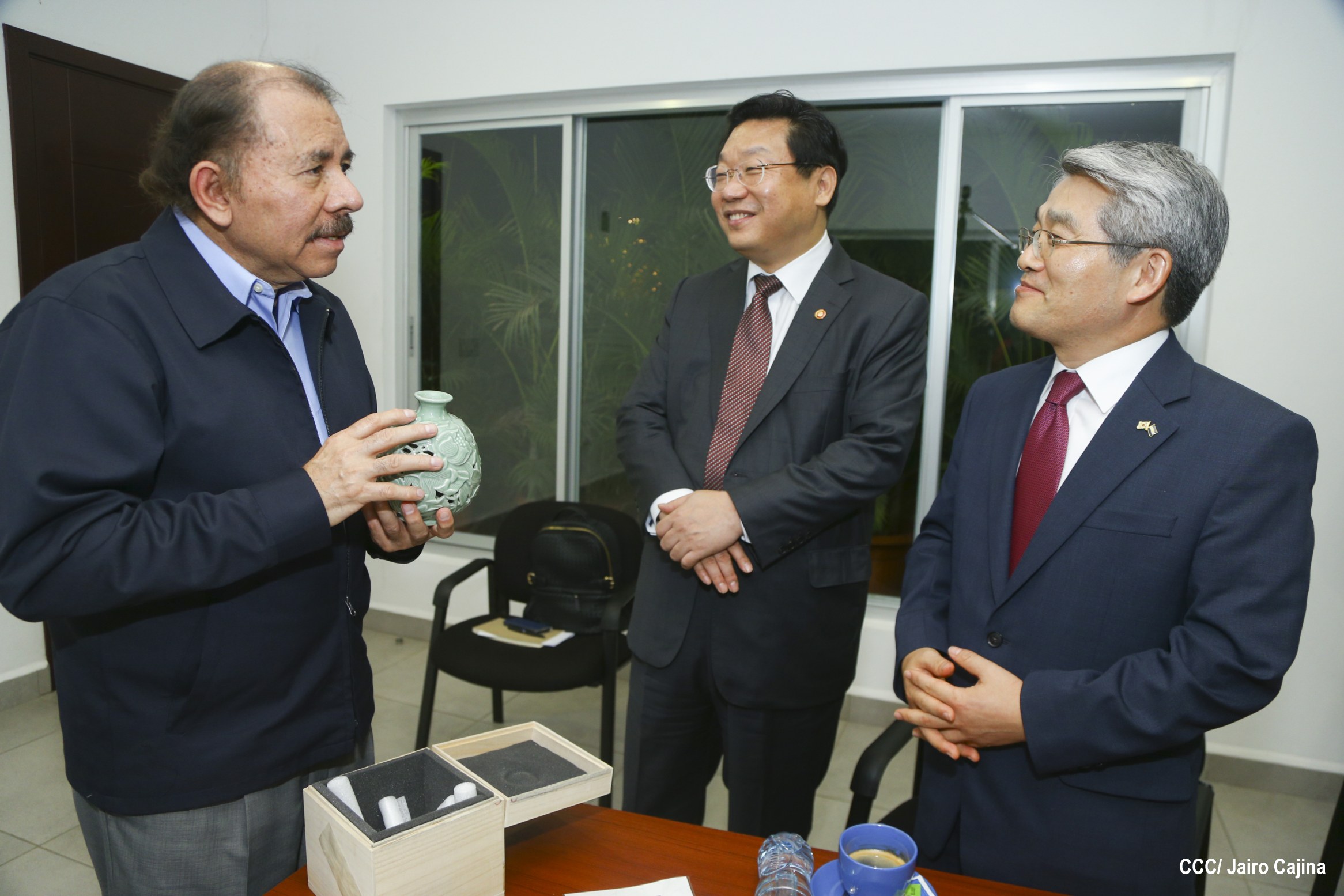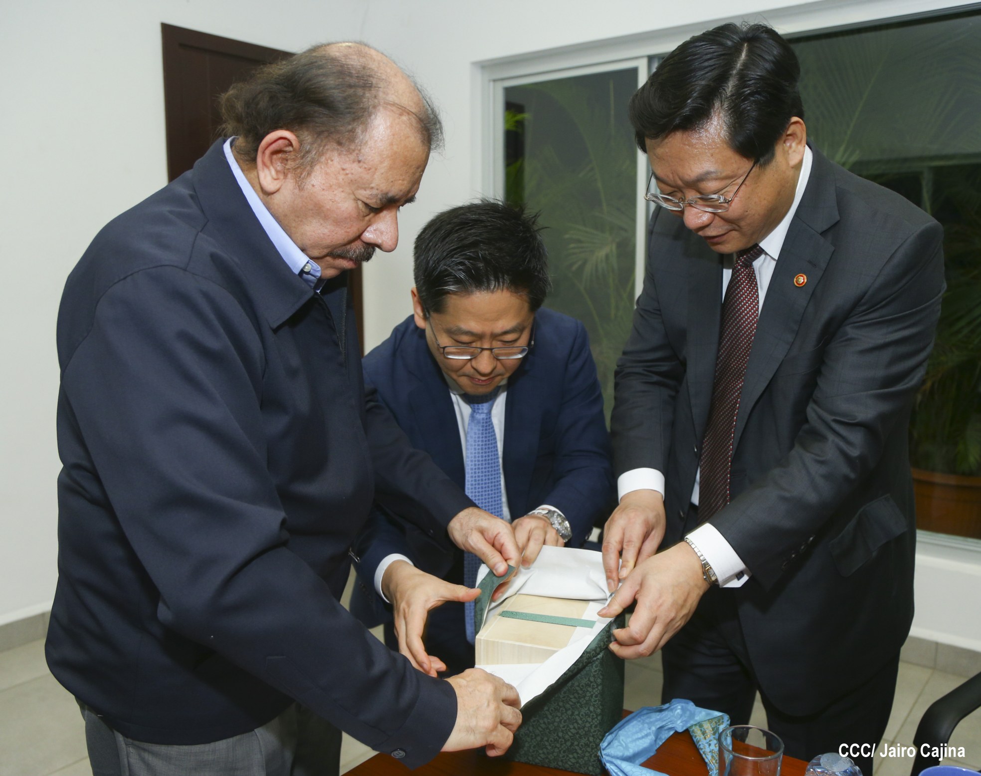 El Presidente de la República, Comandante Daniel Ortega Saavedra, se reunió con el Ministro de Comercio, Industria y Energía de Corea, señor Hyunghwan JOO, quien se encuentra en Nicaragua para anunciar la conclusión de las negociaciones del Tratado de Libre Comercio (TLC) entre Centroamérica y la República de Corea.