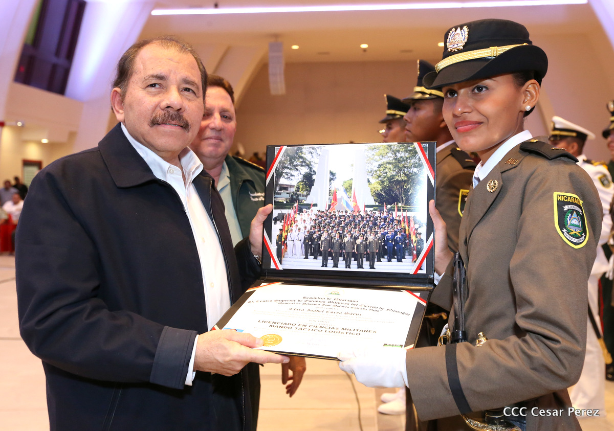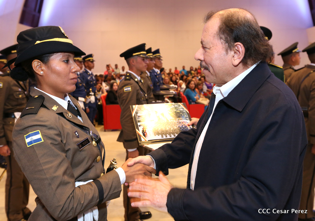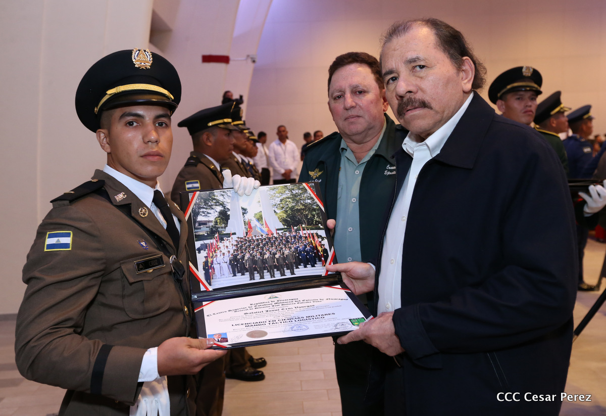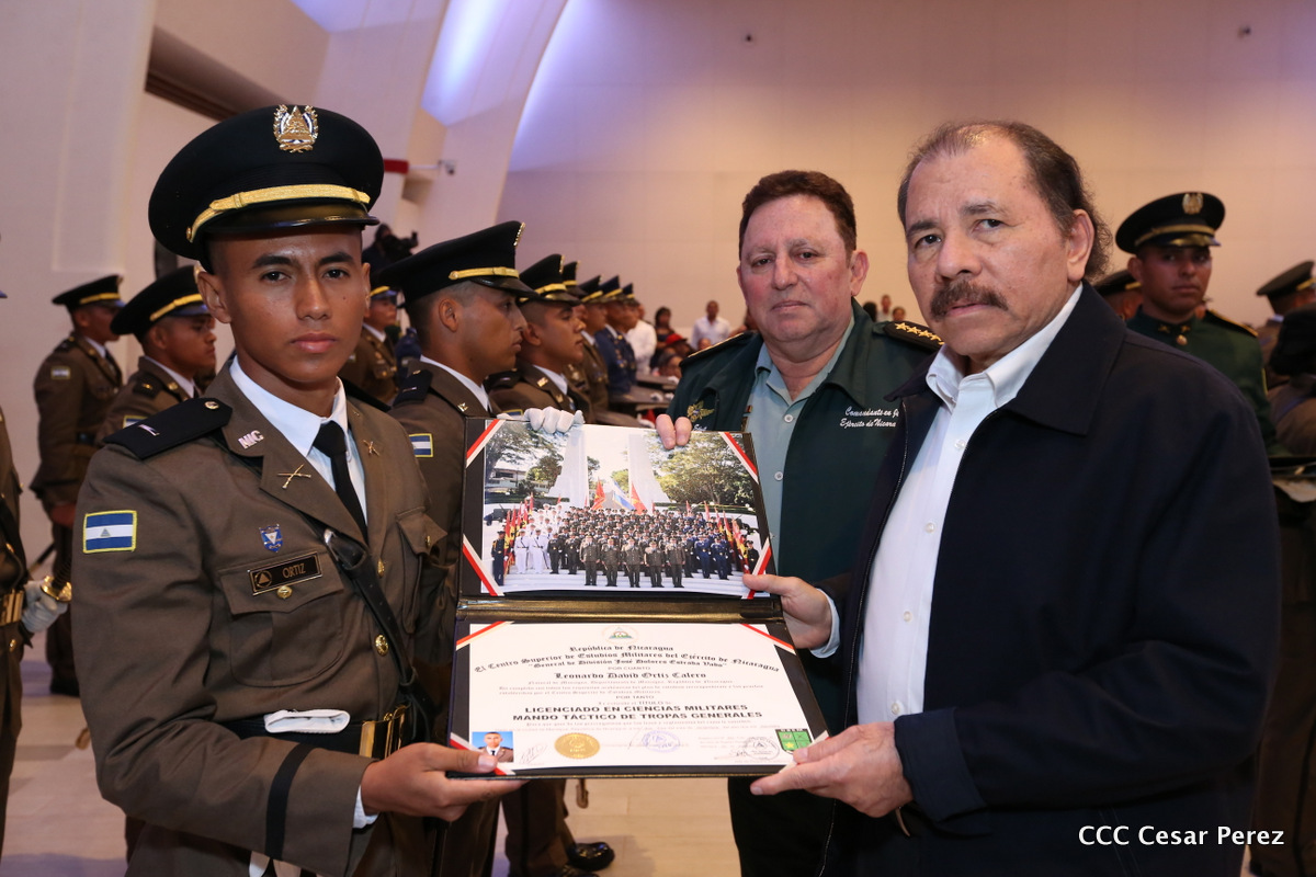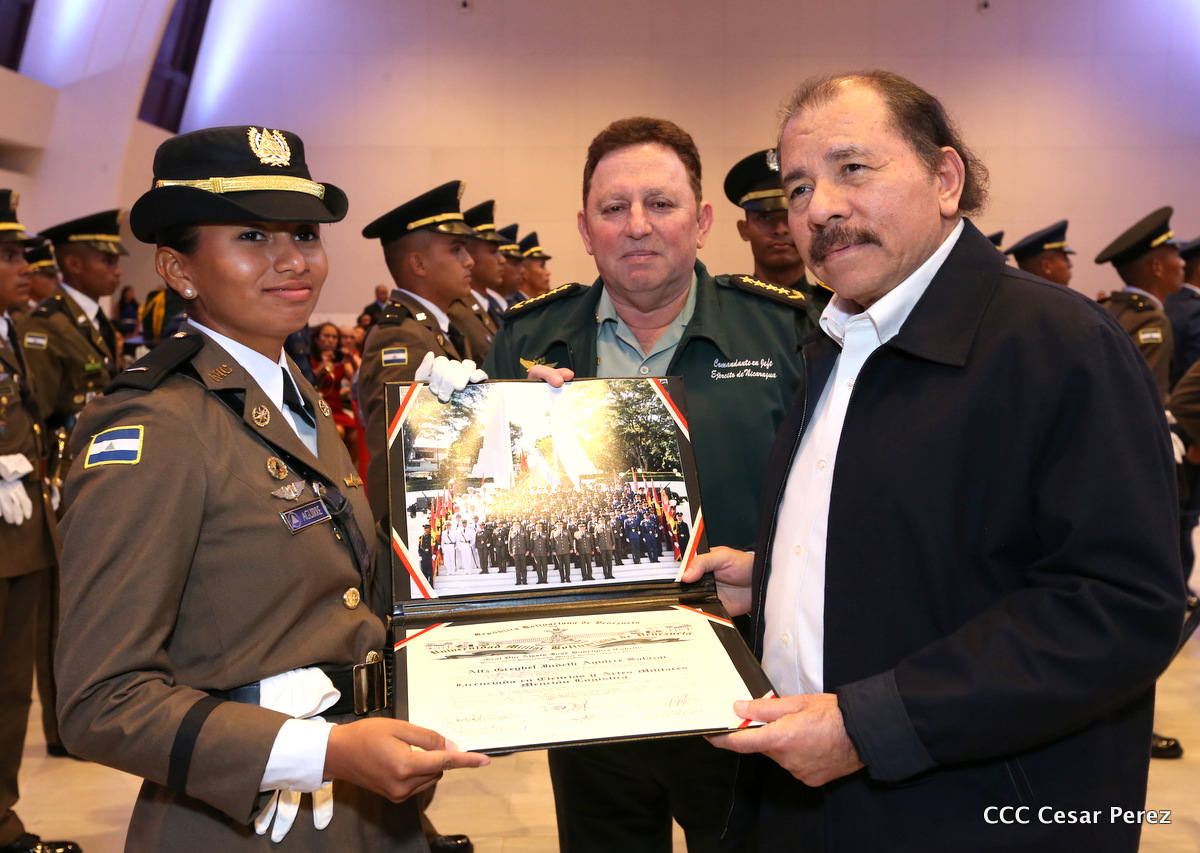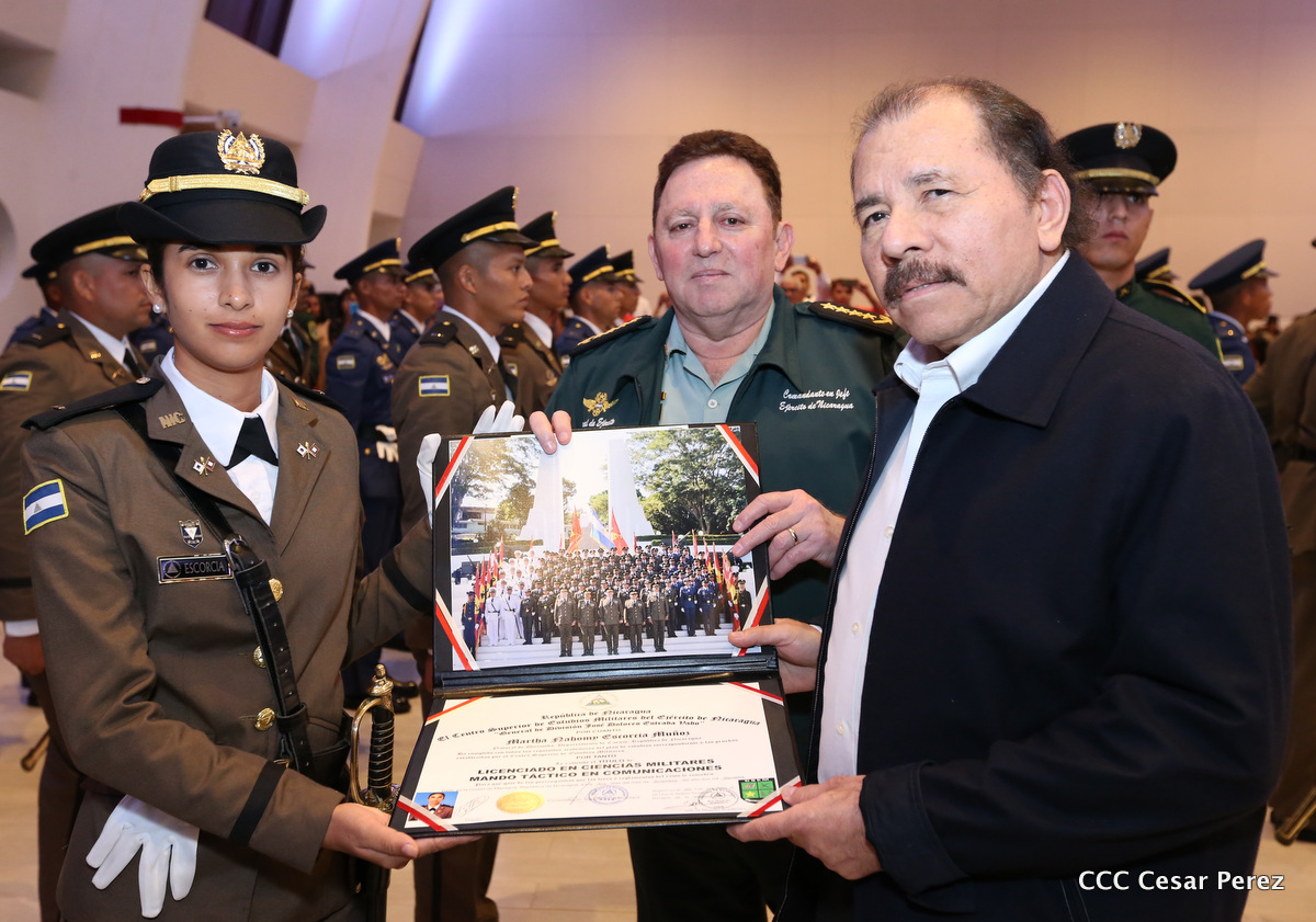 El Presidente de la República, Comandante Daniel Ortega Saavedra, y la Coordinadora del Consejo de Comunicación y Ciudadanía, Compañera Rosario Murillo, presidieron este lunes la XXI Graduación del Curso Regular de Damas y Caballeros Cadetes del Ejército de Nicaragua “Héroe Nacional Rubén Darío”.