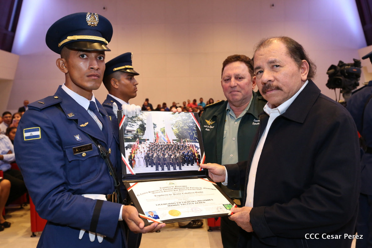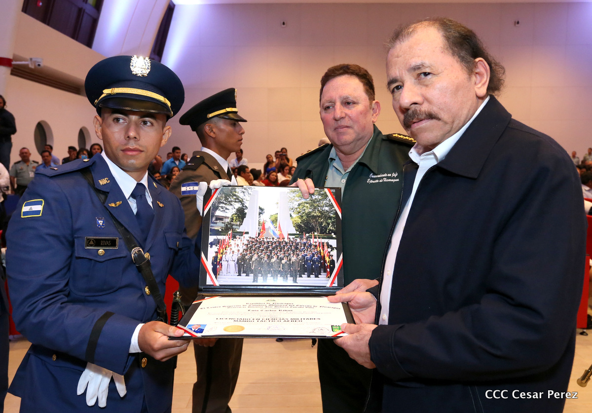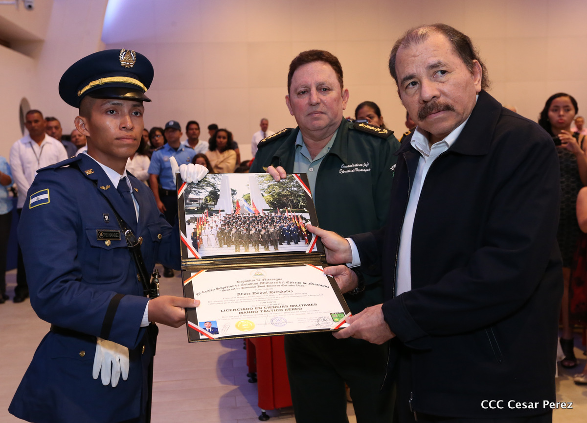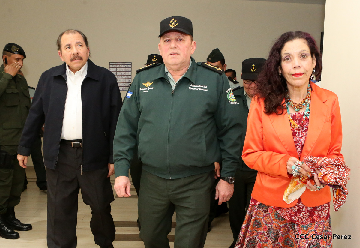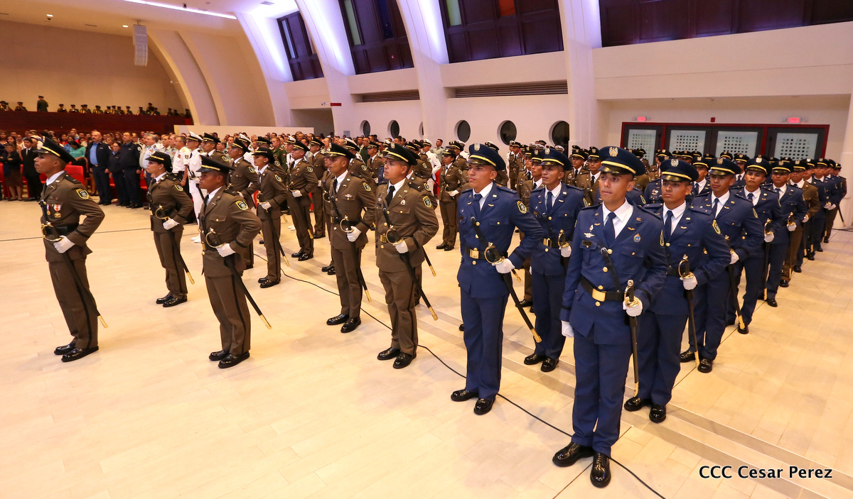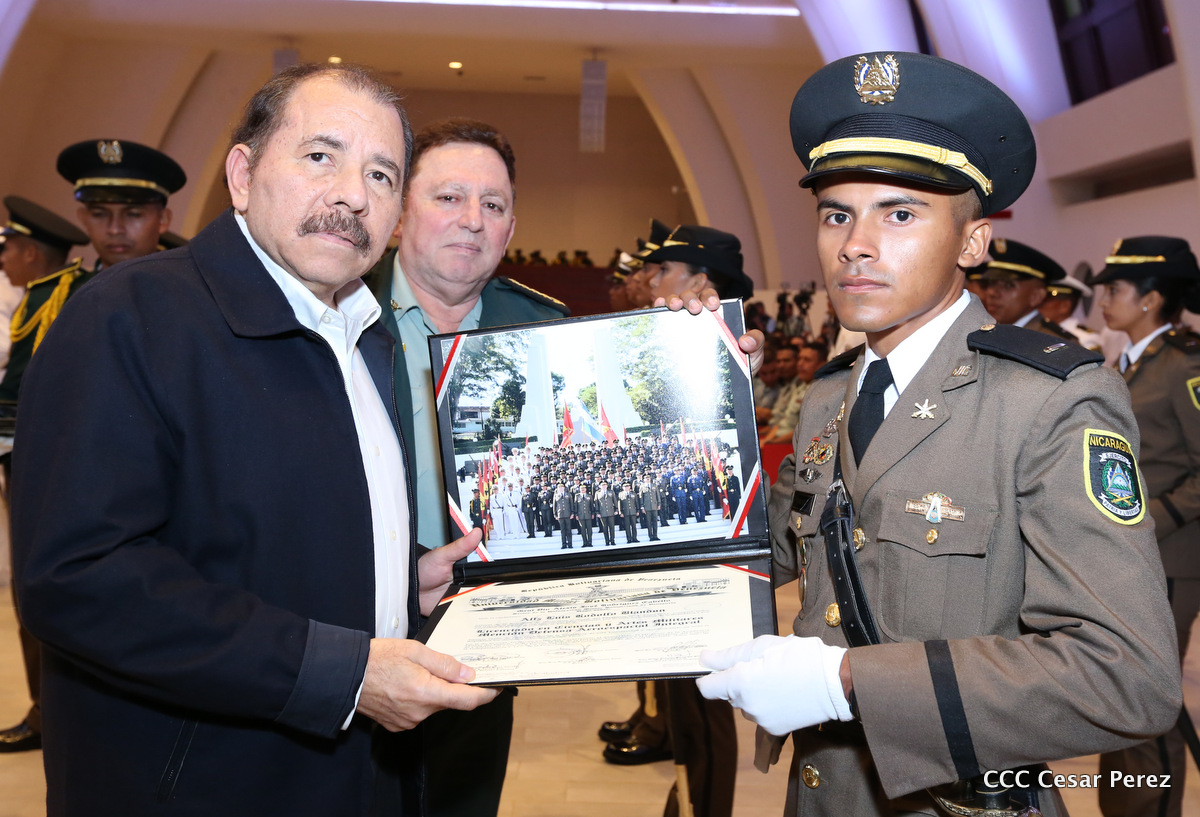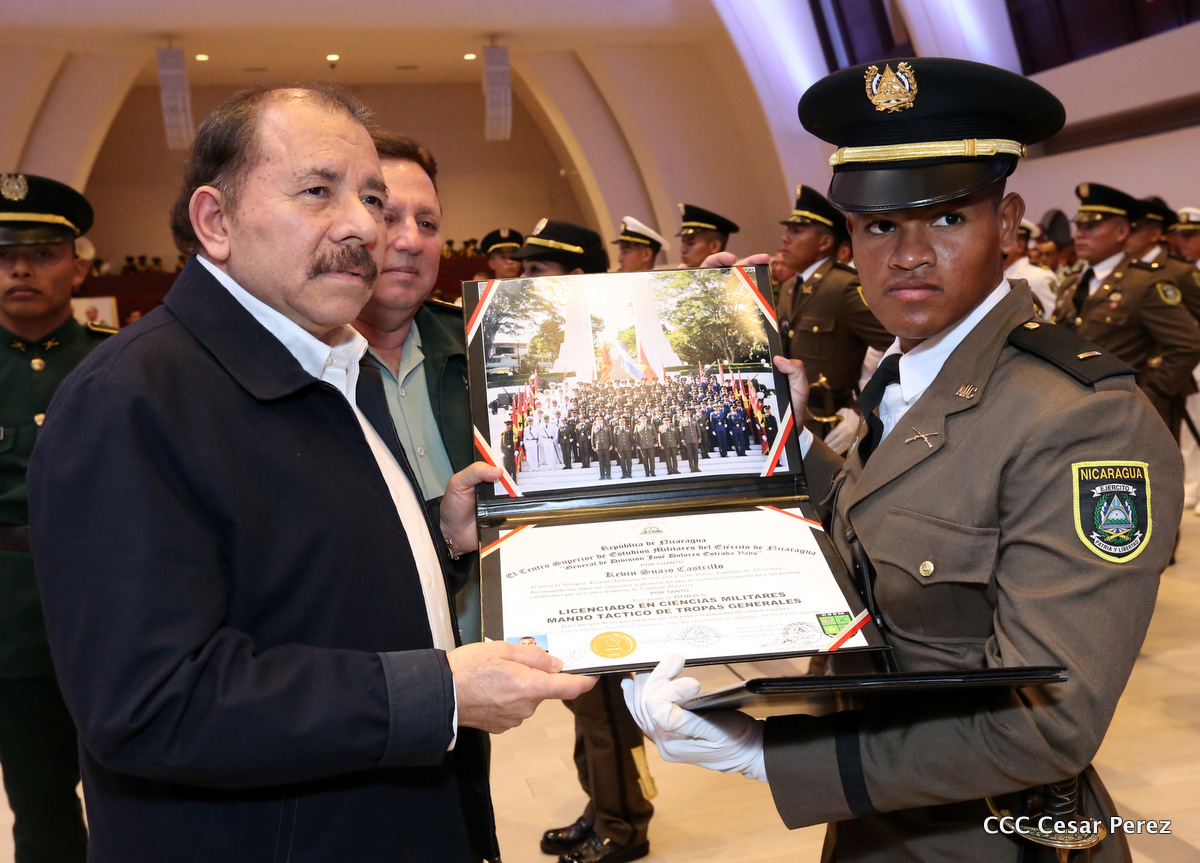 El Presidente de la República, Comandante Daniel Ortega Saavedra, y la Coordinadora del Consejo de Comunicación y Ciudadanía, Compañera Rosario Murillo, presidieron este lunes la XXI Graduación del Curso Regular de Damas y Caballeros Cadetes del Ejército de Nicaragua “Héroe Nacional Rubén Darío”.